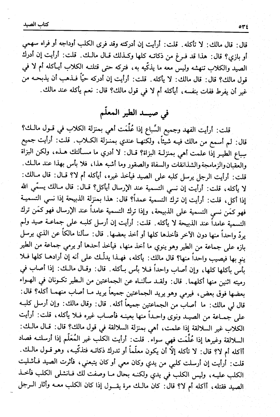 قُلْتُ: أَرَأَيْتَ إنْ أَرْسَلَ كَلْبَهُ عَلَى جَمَاعَةِ صَيْدٍ وَلَمْ يُرِدْ وَاحِدًا مِنْهَا دُونَ الْآخَرِ فَأَخَذَهَا كُلَّهَا أَوْ أَخَذَ بَعْضَهَا. قَالَ: سَأَلْنَا مَالِكًا عَنْ الَّذِي يُرْسِلُ بَازَهُ عَلَى جَمَاعَةٍ مِنْ الطَّيْرِ وَهُوَ يَنْوِي مَا أَخَذَ مِنْهَا، فَيَأْخُذُ أَحَدَهَا أَوْ يَرْمِي جَمَاعَةً مِنْ الطَّيْرِ يَنْوِي بِهَا فَيُصِيبُ وَاحِدًا مِنْهَا؟