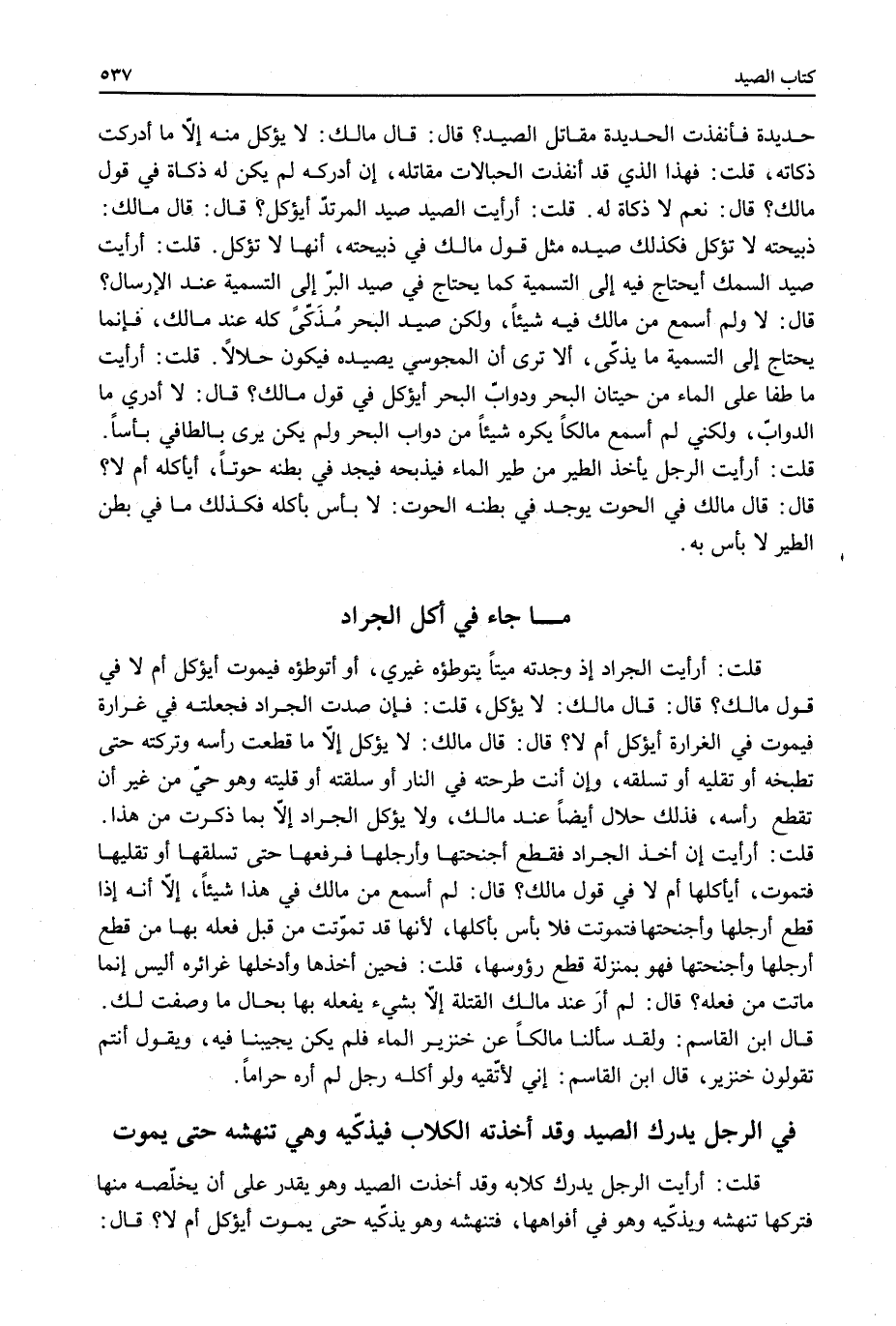قُلْتُ: أَرَأَيْتَ إنْ أَخَذَ الْجَرَادَ فَقَطَعَ أَجْنِحَتَهَا وَأَرْجُلَهَا فَرَفَعَهَا حَتَّى تَسْلُقَهَا أَوْ تَقْلِيَهَا فَتَمُوتَ، أَيَأْكُلُهَا أَمْ لَا فِي قَوْلِ مَالِكٍ؟