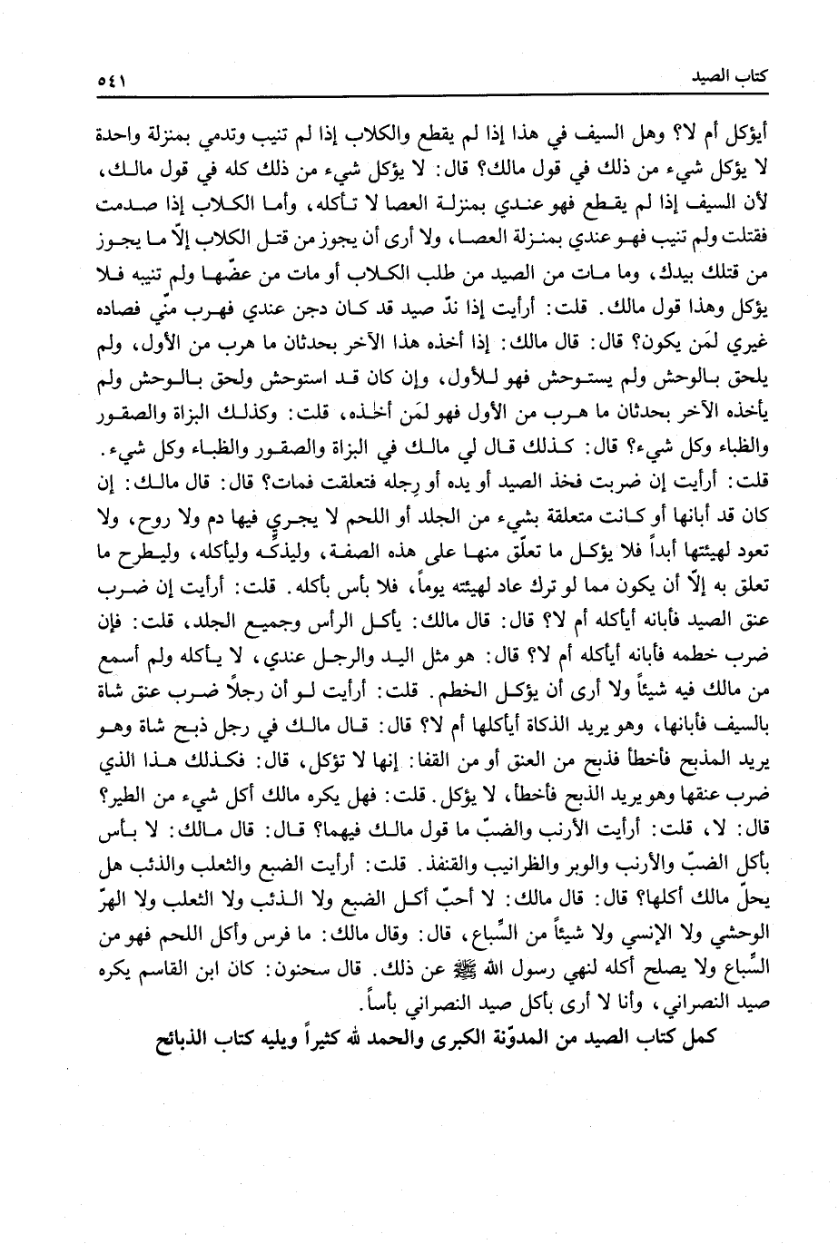 قُلْتُ: أَرَأَيْتَ الضَّبُعَ وَالثَّعْلَبَ وَالذِّئْبَ هَلْ يُحِلُّ مَالِكٌ أَكْلَهَا؟ قَالَ: قَالَ مَالِكٌ. لَا أُحِبُّ أَكْلَ الضَّبُعِ وَلَا الذِّئْبِ وَلَا الثَّعْلَبِ وَلَا الْهِرِّ الْوَحْشِيِّ وَلَا الْإِنْسِيِّ وَلَا شَيْئًا مِنْ السِّبَاعِ.