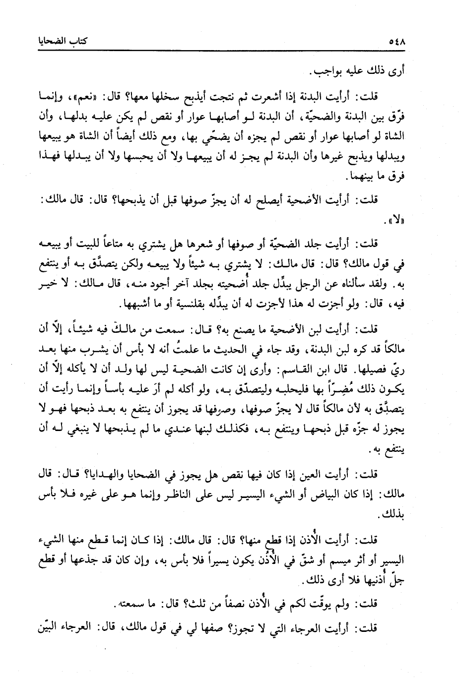 قُلْتُ: أَرَأَيْتَ الْأُضْحِيَّةَ أَيَصْلُحُ لَهُ أَنْ يَجُزَّ صُوفَهَا قَبْلَ أَنْ يَذْبَحَهَا؟ قَالَ: قَالَ مَالِكٌ: " لَا "