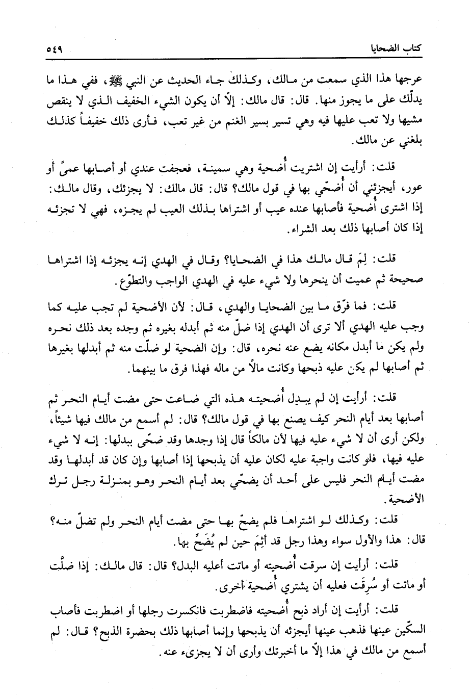قُلْتُ: أَرَأَيْتَ إنْ سُرِقَتْ أُضْحِيَّتَهُ أَوْ مَاتَتْ أَعَلَيْهِ الْبَدَلُ؟ قَالَ: قَالَ مَالِكٌ: إذَا ضَلَّتْ أَوْ مَاتَتْ أَوْ سُرِقَتْ فَعَلَيْهِ أَنْ يَشْتَرِيَ أُضْحِيَّةً أُخْرَى.