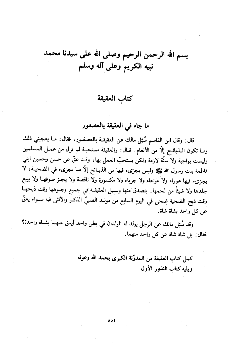 قَالَ: وَالْعَقِيقَةُ مُسْتَحَبَّةٌ لَمْ تَزَلْ مِنْ عَمَلِ الْمُسْلِمِينَ وَلَيْسَتْ بِوَاجِبَةٍ وَلَا سُنَّةٍ لَازِمَةٍ وَلَكِنْ يُسْتَحَبُّ الْعَمَلُ بِهَا، وَقَدْ عُقَّ عَنْ حَسَنٍ وَحُسَيْنٍ ابْنَيْ فَاطِمَةَ بِنْتِ رَسُولِ اللَّهِ - صَلَّى اللَّهُ عَلَيْهِ وَسَلَّمَ - وَلَيْسَ يُجْزِئُ فِيهَا مِنْ الذَّبَائِحِ إلَّا مَا يُجْزِئُ فِي الضَّحِيَّةِ، لَا يُجْزِئُ فِيهَا عَوْرَاءُ وَلَا عَرْجَاءُ وَلَا جَرْبَاءُ وَلَا مَكْسُورَةٌ وَلَا نَاقِصَةٌ وَلَا يَجُزُّ صُوفَهَا وَلَا يَبِيعُ جِلْدَهَا وَلَا شَيْئًا مِنْ لَحْمِهَا. يَتَصَدَّقُ مِنْهَا وَسَبِيلُ الْعَقِيقَةِ فِي جَمِيعِ وُجُوهِهَا وَقْتُ ذَبْحِهَا وَقْتُ ذَبْحِ الضَّحِيَّةِ ضُحًى فِي الْيَوْمِ السَّابِعِ مِنْ مَوْلِدِ الصَّبِيِّ الذَّكَرُ وَالْأُنْثَى فِيهِ سَوَاءٌ يَعُقُّ عَنْ كُلِّ وَاحِدٍ بِشَاةٍ شَاةٍ.