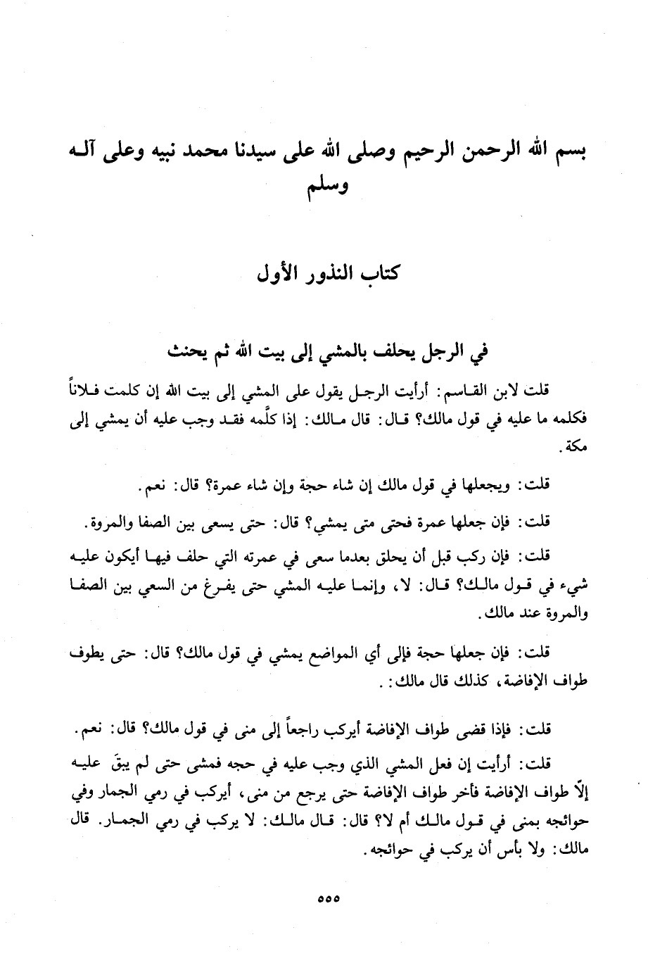ُ قُلْتُ لِابْنِ الْقَاسِمِ: أَرَأَيْتَ الرَّجُلَ يَقُولُ عَلِيّ الْمَشْيُ إلَى بَيْتِ اللَّهِ إنْ كَلَّمْتُ فُلَانًا فَكَلَّمَهُ مَا عَلَيْهِ فِي قَوْلِ مَالِكٍ؟