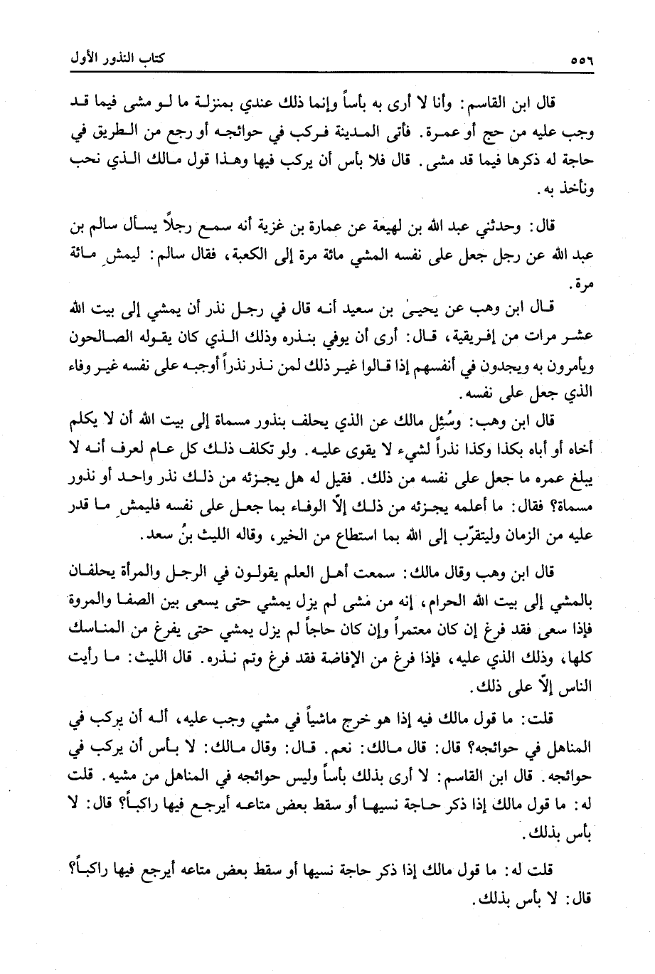 قَالَ ابْنُ الْقَاسِمِ: وَأَنَا لَا أَرَى بِهِ بَأْسًا وَإِنَّمَا ذَلِكَ عِنْدِي بِمَنْزِلَةِ مَا لَوْ مَشَى فِيمَا قَدْ وَجَبَ عَلَيْهِ مِنْ حَجٍّ أَوْ عُمْرَةٍ. فَأَتَى الْمَدِينَةَ فَرَكِبَ فِي حَوَائِجِهِ أَوْ رَجَعَ مِنْ الطَّرِيقِ فِي حَاجَةٍ لَهُ ذَكَرَهَا فِيمَا قَدْ مَشَى. قَالَ فَلَا بَأْسَ أَنْ يَرْكَبَ فِيهَا وَهَذَا قَوْلُ مَالِكٍ الَّذِي نُحِبُّ وَنَأْخُذُ بِهِ. قَالَ: وَحَدَّثَنِي عَبْدُ اللَّهِ بْنُ لَهِيعَةَ عَنْ عُمَارَةَ بْنِ غَزِيَّةَ أَنَّهُ سَمِعَ رَجُلًا يَسْأَلُ سَالِمَ بْنَ عَبْدِ اللَّهِ عَنْ رَجُلٍ جَعَلَ عَلَى نَفْسِهِ الْمَشْيَ مِائَةَ مَرَّةٍ إلَى الْكَعْبَةِ، فَقَالَ سَالِمٌ: لِيَمْشِ مِائَةَ مَرَّةٍ. قَالَ ابْنُ وَهْبٍ عَنْ يَحْيَى بْنِ سَعِيدٍ أَنَّهُ قَالَ فِي رَجُلٍ نَذَرَ أَنْ يَمْشِيَ إلَى بَيْتِ اللَّهِ عَشْرَ مَرَّاتٍ مِنْ إفْرِيقِيَّةَ، قَالَ: أَرَى أَنْ يُوفِيَ بِنَذْرِهِ وَذَلِكَ الَّذِي كَانَ يَقُولُهُ الصَّالِحُونَ وَيَأْمُرُونَ بِهِ وَيَجِدُونَ فِي أَنْفُسِهِمْ إذَا قَالُوا غَيْرَ ذَلِكَ لِمَنْ نَذَرَ نَذْرًا أَوْجَبَهُ عَلَى نَفْسِهِ غَيْرَ وَفَاءِ الَّذِي جَعَلَ عَلَى نَفْسِهِ.