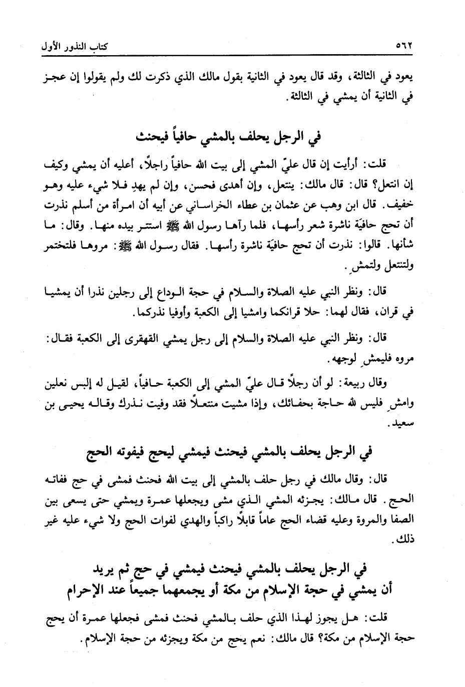 قَالَ ابْنُ وَهْبٍ عَنْ عُثْمَانَ بْنِ عَطَاءٍ الْخُرَاسَانِيِّ عَنْ أَبِيهِ أَنَّ امْرَأَةً مِنْ أَسْلَمَ نَذَرَتْ أَنْ تَحُجَّ حَافِيَةً نَاشِرَةً شَعْرَ رَأْسِهَا، فَلَمَّا رَآهَا رَسُولُ اللَّهِ - صَلَّى اللَّهُ عَلَيْهِ وَسَلَّمَ - اسْتَتَرَ بِيَدِهِ مِنْهَا. وَقَالَ: مَا شَأْنُهَا. قَالُوا: نَذَرَتْ أَنْ تَحُجَّ حَافِيَةً نَاشِرَةً رَأْسَهَا. فَقَالَ رَسُولُ اللَّهِ - صَلَّى اللَّهُ عَلَيْهِ وَسَلَّمَ - «مُرُوهَا فَلْتَخْتَمِرْ وَلْتَنْتَعِلْ وَلْتَمْشِ.» قَالَ: «وَنَظَرَ النَّبِيُّ - عَلَيْهِ الصَّلَاةُ وَالسَّلَامُ - فِي حَجَّةِ الْوَدَاعِ إلَى رَجُلَيْنِ نَذَرَا أَنْ يَمْشِيَا فِي قِرَانٍ، فَقَالَ لَهُمَا: حِلَّا قِرَانَكُمَا وَامْشِيَا إلَى الْكَعْبَةِ وَأَوْفِيَا نَذْرَكُمَا.» قَالَ: «وَنَظَرَ النَّبِيُّ - عَلَيْهِ الصَّلَاةُ وَالسَّلَامُ - إلَى رَجُلٍ يَمْشِي الْقَهْقَرَى إلَى الْكَعْبَةِ فَقَالَ: مُرُوهُ فَلْيَمْشِ لِوَجْهِهِ» . وَقَالَ رَبِيعَةُ: لَوْ أَنَّ رَجُلًا قَالَ عَلَيَّ الْمَشْيُ إلَى الْكَعْبَةِ حَافِيًا لَقِيلَ لَهُ الْبَسْ نَعْلَيْنِ وَامْشِ فَلَيْسَ لِلَّهِ حَاجَةٌ بِحَفَائِك، وَإِذَا مَشَيْت مُنْتَعِلًا فَقَدْ وَفَّيْتَ نَذْرَكَ وَقَالَهُ يَحْيَى بْنُ سَعِيدٍ.