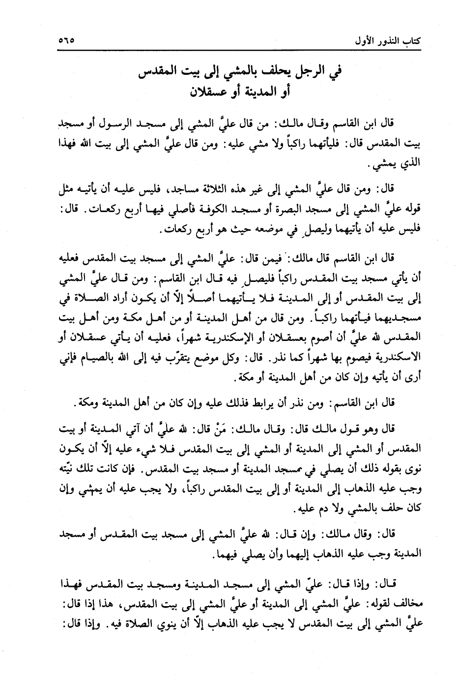 قَالَ ابْنُ الْقَاسِمِ قَالَ مَالِكٌ: فِيمَنْ قَالَ عَلَيَّ الْمَشْيُ إلَى مَسْجِدِ بَيْتِ الْمَقْدِسِ فَعَلَيْهِ أَنْ يَأْتِيَ مَسْجِدَ بَيْتِ الْمَقْدِسِ رَاكِبًا فَلْيُصَلِّ فِيهِ قَالَ ابْنُ الْقَاسِمِ: وَمَنْ قَالَ عَلَيَّ الْمَشْيُ إلَى بَيْتِ الْمَقْدِسِ أَوْ إلَى الْمَدِينَةِ فَلَا يَأْتِيهِمَا أَصْلًا إلَّا أَنْ يَكُونَ أَرَادَ الصَّلَاةَ فِي مَسْجِدَيْهِمَا فَيَأْتِيَهُمَا رَاكِبًا. وَمَنْ قَالَ مَنْ أَهْلِ الْمَدِينَةِ أَوْ مَنْ أَهْلِ مَكَّةَ وَمِنْ أَهْلِ بَيْتِ الْمَقْدِسِ: لِلَّهِ عَلَيَّ أَنْ أَصُومَ بِعَسْقَلَانَ أَوْ الْإِسْكَنْدَرِيَّة شَهْرًا. فَعَلَيْهِ أَنْ يَأْتِيَ عَسْقَلَانَ أَوْ الْإِسْكَنْدَرِيَّة فَيَصُومَ بِهَا شَهْرًا كَمَا نَذَرَ. قَالَ: وَكُلُّ مَوْضِعٍ يُتَقَرَّبُ فِيهِ إلَى اللَّهِ بِالصِّيَامِ فَإِنِّي أَرَى أَنْ يَأْتِيَهُ وَإِنْ كَانَ مِنْ أَهْلِ الْمَدِينَةِ أَوْ مَكَّةَ