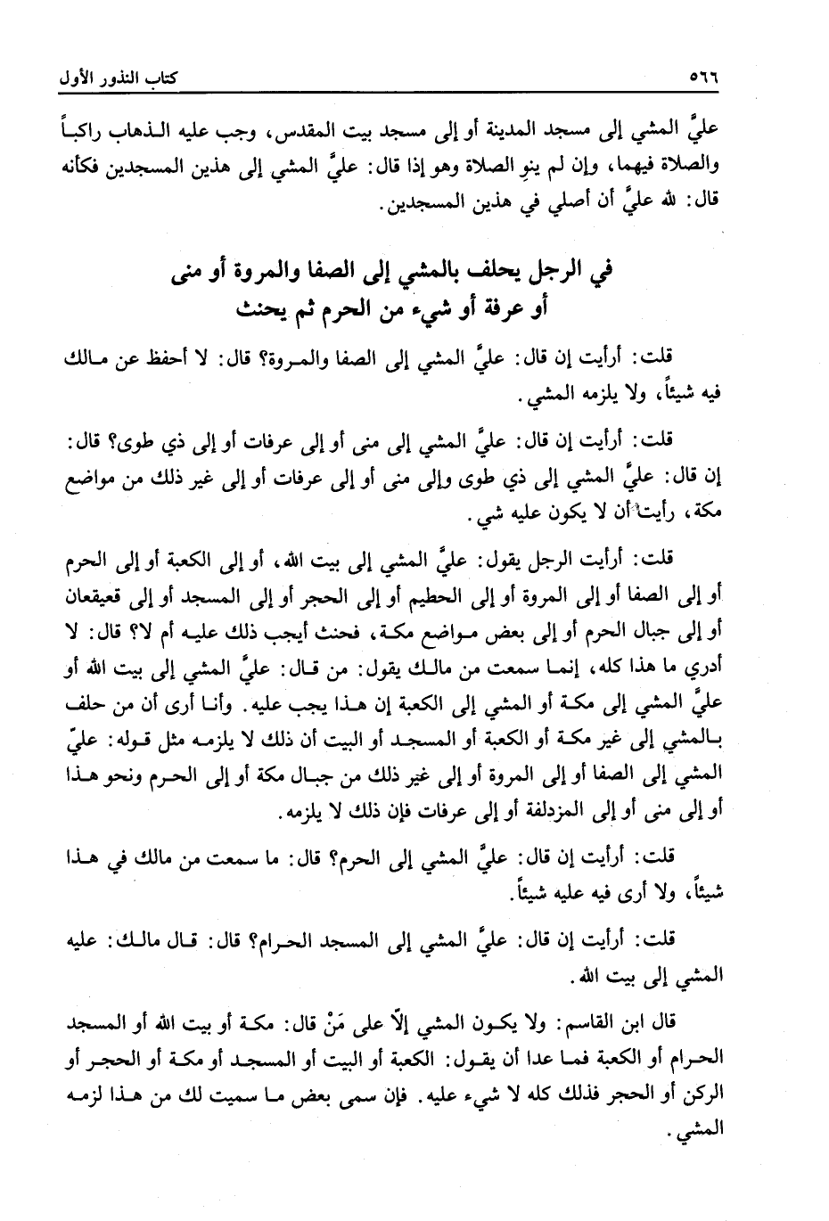 قَالَ: لَا أَدْرِي مَا هَذَا كُلَّهُ، إنَّمَا سَمِعْتُ مِنْ مَالِكٍ يَقُولُ: مَنْ قَالَ عَلَيَّ الْمَشْيُ إلَى بَيْتِ اللَّهِ أَوْ عَلَيَّ الْمَشْيُ إلَى مَكَّةَ أَوْ الْمَشْيُ إلَى الْكَعْبَةِ، إنَّ هَذَا يَجِبُ عَلَيْهِ. وَأَنَا أَرَى أَنَّ مَنْ حَلَفَ بِالْمَشْيِ إلَى غَيْرِ مَكَّةَ أَوْ الْكَعْبَةِ أَوْ الْمَسْجِدِ أَوْ الْبَيْتِ أَنَّ ذَلِكَ لَا يَلْزَمُهُ مِثْلُ قَوْلِهِ عَلَيَّ الْمَشْيُ إلَى الصَّفَا أَوْ إلَى الْمَرْوَةِ أَوْ إلَى غَيْرِ ذَلِكَ مِنْ جِبَالِ مَكَّةَ أَوْ إلَى الْحَرَمِ وَنَحْوِ هَذَا أَوْ إلَى مِنًى أَوْ إلَى الْمُزْدَلِفَةِ أَوْ إلَى عَرَفَاتٍ فَإِنَّ ذَلِكَ لَا يَلْزَمُهُ.