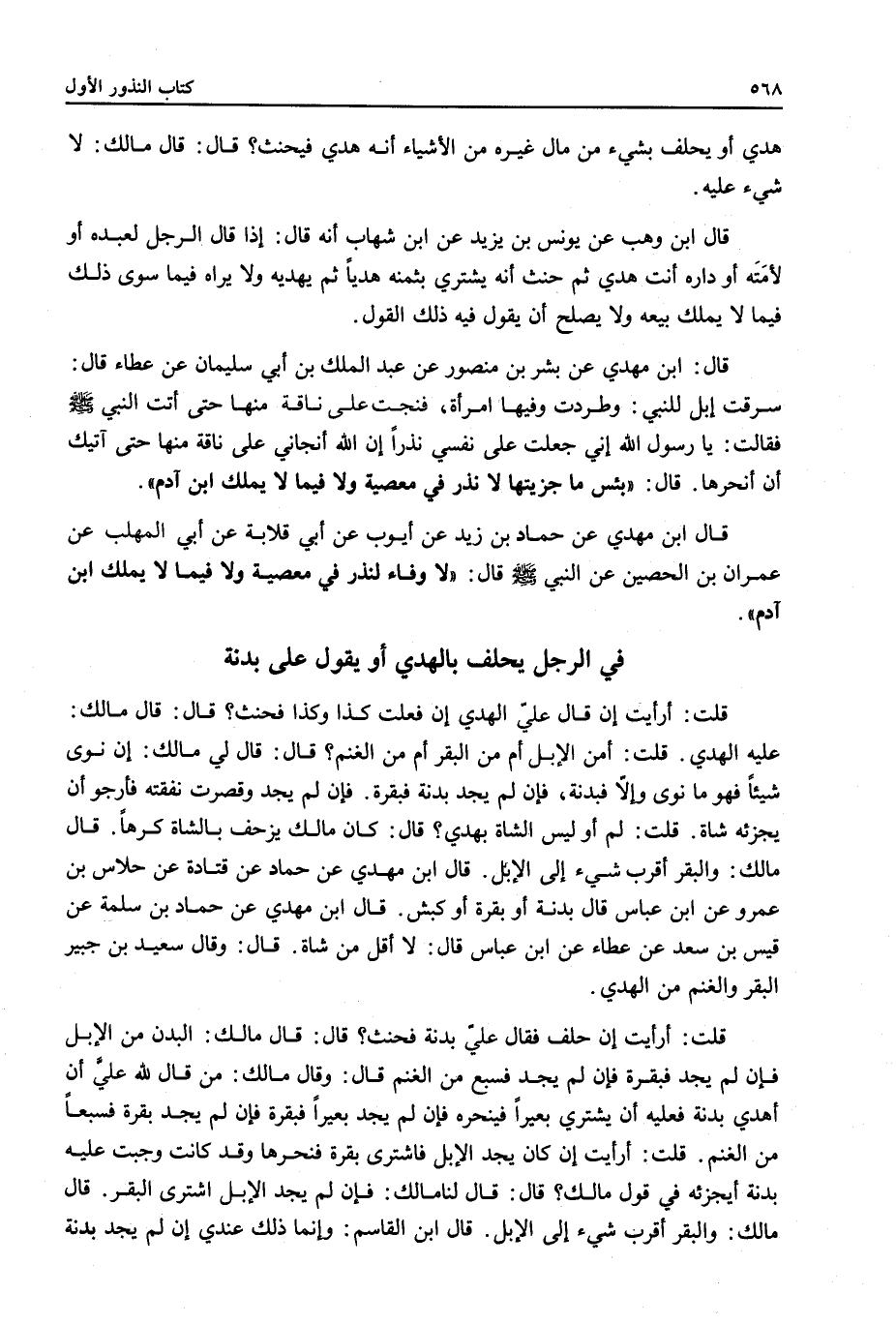 قَالَ: ابْنُ مَهْدِيٍّ عَنْ بِشْرِ بْنِ مَنْصُورٍ عَنْ عَبْدِ الْمَلِكِ بْنِ أَبِي سُلَيْمَانَ عَنْ عَطَاءٍ قَالَ: «سُرِقَتْ إبِلٌ لِلنَّبِيِّ: وَطُرِدَتْ وَفِيهَا امْرَأَةٌ، فَنَجَتْ عَلَى نَاقَةٍ مِنْهَا حَتَّى أَتَتْ النَّبِيَّ - صَلَّى اللَّهُ عَلَيْهِ وَسَلَّمَ - فَقَالَتْ: يَا رَسُولَ اللَّهِ إنِّي جَعَلْتُ عَلَى نَفْسِي نَذْرًا؛ إنْ اللَّهُ أَنْجَانِي، عَلَى نَاقَةٍ مِنْهَا حَتَّى آتِيَك أَنْ أَنْحَرَهَا. قَالَ: بِئْسَ مَا جَزَيْتِهَا لَا نَذْرَ فِي مَعْصِيَةٍ وَلَا فِيمَا لَا يَمْلِكُ ابْنُ آدَمَ» .