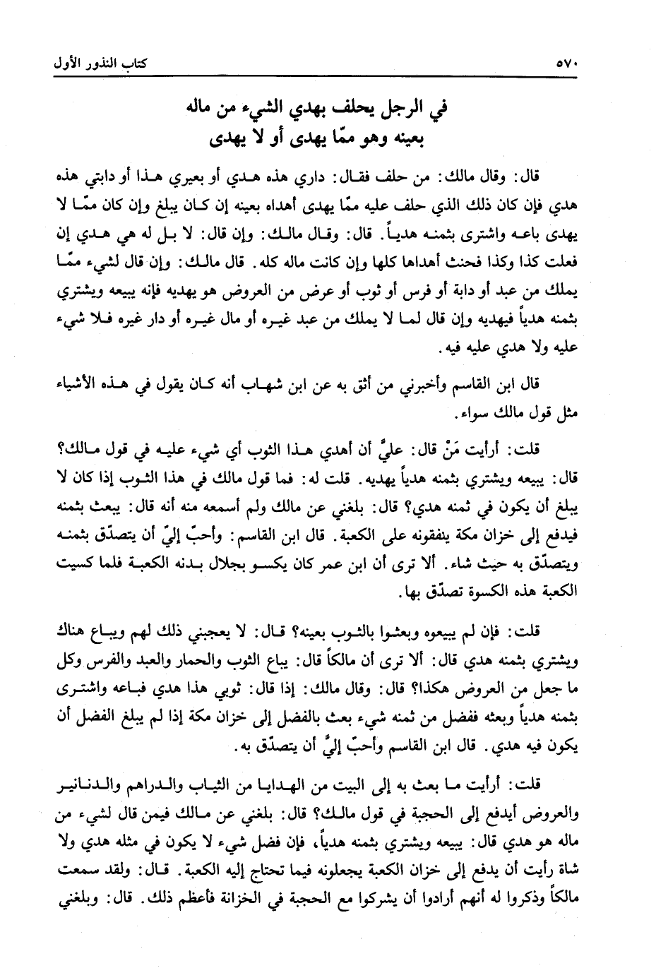 قُلْتُ: أَرَأَيْت مَنْ قَالَ: عَلَيَّ أَنْ أُهْدِيَ هَذَا الثَّوْبَ. أَيُّ شَيْءٍ عَلَيْهِ فِي قَوْلِ مَالِكٍ؟