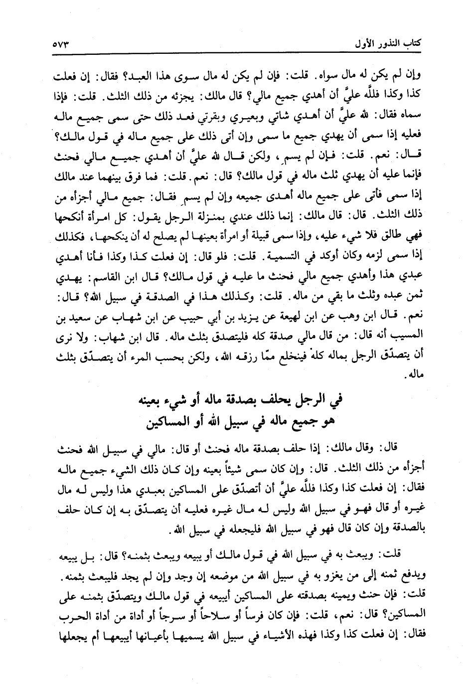 فِي الرَّجُلِ يَحْلِفُ بِصَدَقَةِ مَالِهِ أَوْ شَيْءٍ بِعَيْنِهِ هُوَ جَمِيعُ مَالِهِ فِي سَبِيلِ اللَّهِ أَوْ الْمَسَاكِينِ قَالَ: وَقَالَ مَالِكٌ: إذَا حَلَفَ بِصَدَقَةِ مَالِهِ فَحَنِثَ أَوْ قَالَ: مَالِي فِي سَبِيلِ اللَّهِ فَحَنِثَ أَجْزَأَهُ مِنْ ذَلِكَ الثُّلُثُ.