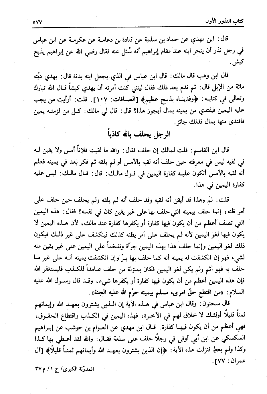 قَالَ سَحْنُونٌ: وَقَالَ ابْنُ عَبَّاسٍ فِي هَذِهِ الْآيَةِ {إنَّ الَّذِينَ يَشْتَرُونَ بِعَهْدِ اللَّهِ وَأَيْمَانِهِمْ ثَمَنًا قَلِيلًا أُولَئِكَ لَا خَلَاقَ لَهُمْ فِي الْآخِرَةِ} [آل عمران: 77] ، فَهَذِهِ الْيَمِينُ فِي الْكَذِبِ وَاقْتِطَاعِ الْحُقُوقِ، فَهِيَ أَعْظَمُ مِنْ أَنْ يَكُونَ فِيهَا كَفَّارَةٌ.