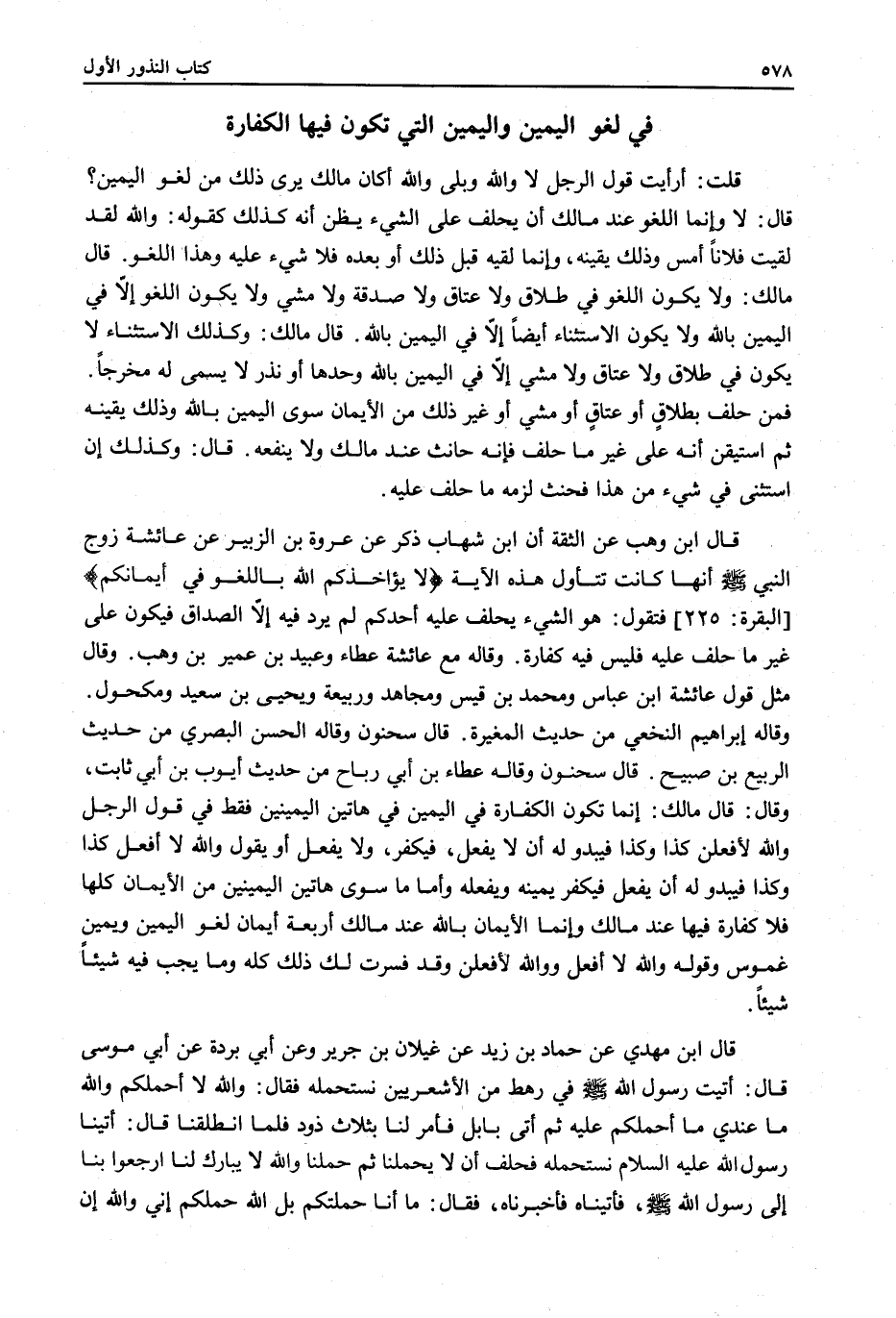 قَالَ: لَا وَإِنَّمَا اللَّغْوُ عِنْدَ مَالِكٍ أَنْ يَحْلِفَ عَلَى الشَّيْءِ يَظُنُّ أَنَّهُ كَذَلِكَ كَقَوْلِهِ: وَاَللَّهِ لَقَدْ لَقِيتُ فُلَانًا أَمْسِ وَذَلِكَ يَقِينُهُ، وَإِنَّمَا لَقِيَهُ قَبْلَ ذَلِكَ أَوْ بَعْدَهُ فَلَا شَيْءَ عَلَيْهِ وَهَذَا اللَّغْوُ.
