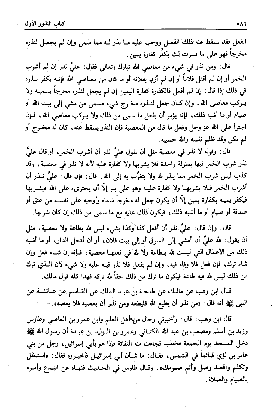 قَالَ ابْنُ وَهْبٍ عَنْ مَالِكٍ عَنْ طَلْحَةَ بْنِ عَبْدِ الْمَلِكِ عَنْ الْقَاسِمِ عَنْ عَائِشَةَ عَنْ النَّبِيِّ - صَلَّى اللَّهُ عَلَيْهِ وَسَلَّمَ - أَنَّهُ قَالَ: «مَنْ نَذَرَ أَنْ يُطِيعَ اللَّهَ فَلْيُطِعْهُ وَمَنْ نَذَرَ أَنْ يَعْصِيَهُ فَلَا يَعْصِهِ» .