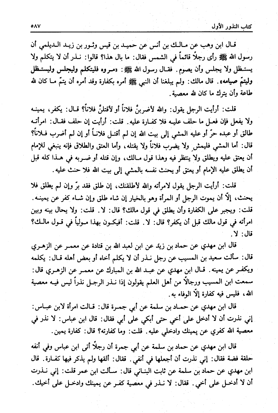 قَالَ ابْنُ وَهْبٍ عَنْ مَالِكِ بْنِ أَنَسٍ عَنْ حُمَيْدِ بْنِ قَيْسٍ وَثَوْرِ بْنِ زَيْدٍ الدِّيلِيِّ «أَنَّ رَسُولَ اللَّهِ - صَلَّى اللَّهُ عَلَيْهِ وَسَلَّمَ - رَأَى رَجُلًا قَائِمًا فِي الشَّمْسِ فَقَالَ: مَا بَالُ هَذَا؟ قَالُوا: نَذَرَ أَنْ لَا يَتَكَلَّمَ وَلَا يَسْتَظِلَّ وَلَا يَجْلِسَ وَأَنْ يَصُومَ. فَقَالَ رَسُولُ اللَّهِ - صَلَّى اللَّهُ عَلَيْهِ وَسَلَّمَ -: مُرُوهُ فَلْيَتَكَلَّمْ وَلْيَجْلِسْ وَلْيَسْتَظِلَّ وَلْيُتِمَّ صِيَامَهُ» . قَالَ مَالِكٌ: وَلَمْ يَبْلُغْنَا أَنَّ النَّبِيَّ - صَلَّى اللَّهُ عَلَيْهِ وَسَلَّمَ - أَمَرَهُ بِكَفَّارَةٍ وَقَدْ أَمَرَهُ أَنْ يُتِمَّ مَا كَانَ لِلَّهِ طَاعَةً وَأَنْ يَتْرُكَ مَا كَانَ لِلَّهِ مَعْصِيَةً