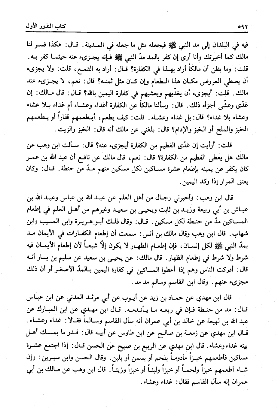 قَالَ ابْنُ وَهْبٍ: وَأَخْبَرَنِي رِجَالٌ مِنْ أَهْلِ الْعِلْمِ عَنْ عَبْدِ اللَّهِ بْنِ عَبَّاسٍ وَعَبْدِ اللَّهِ بْنِ عَيَّاشِ بْنِ أَبِي رَبِيعَةَ وَزَيْدِ بْنِ ثَابِتٍ وَيَحْيَى بْنِ سَعِيدٍ وَغَيْرِهِمْ مِنْ أَهْلِ الْعِلْمِ فِي إطْعَامِ الْمَسَاكِينِ مُدٌّ مِنْ حِنْطَةٍ لِكُلِّ مِسْكِينٍ.