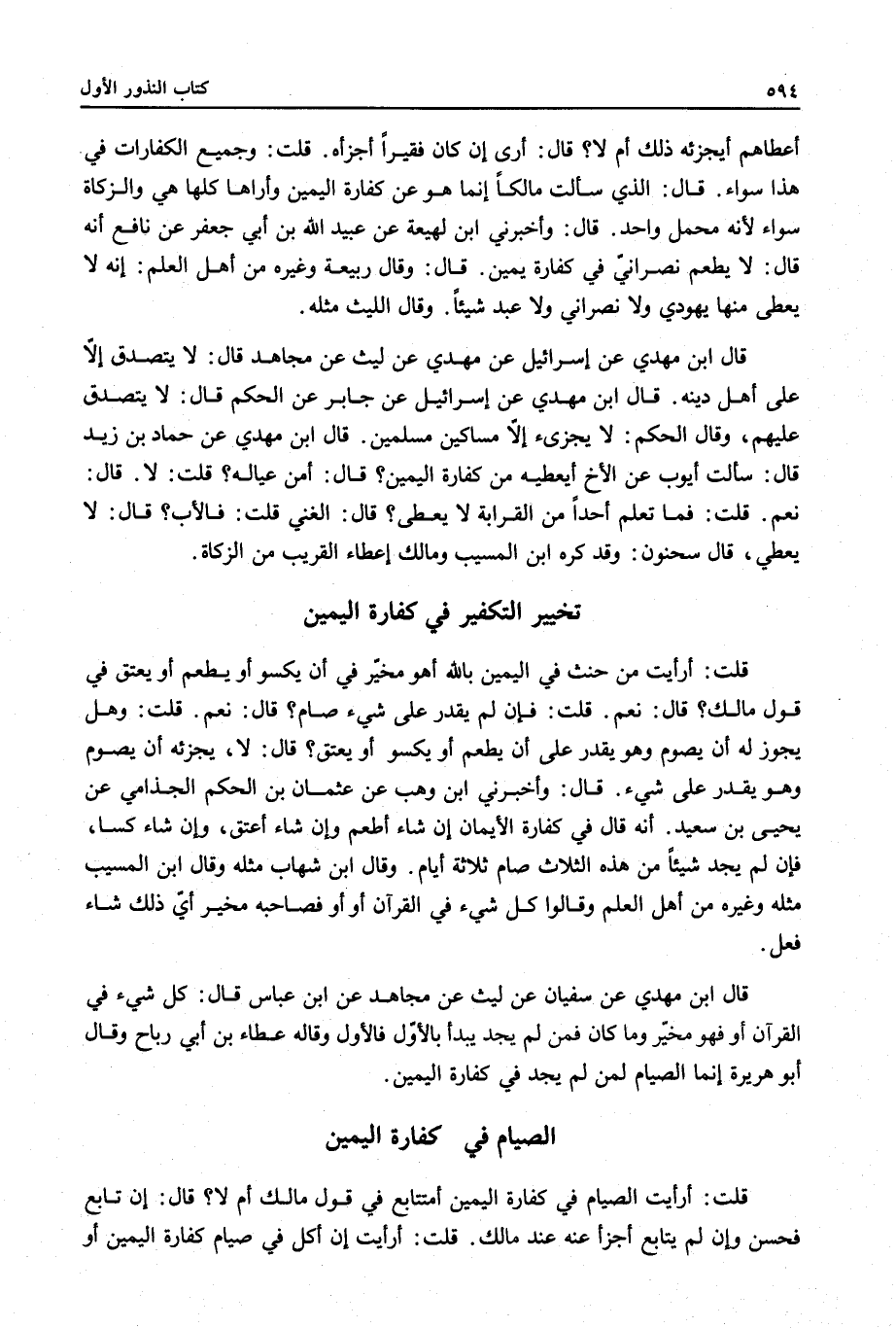 قُلْتُ: وَجَمِيعُ الْكَفَّارَاتِ فِي هَذَا سَوَاءٌ. قَالَ: الَّذِي سَأَلْتُ مَالِكًا إنَّمَا هُوَ عَنْ كَفَّارَةِ الْيَمِينِ وَأَرَاهَا كُلَّهَا هِيَ وَالزَّكَاةُ سَوَاءٌ لِأَنَّهُ مَحْمَلٌ وَاحِدٌ