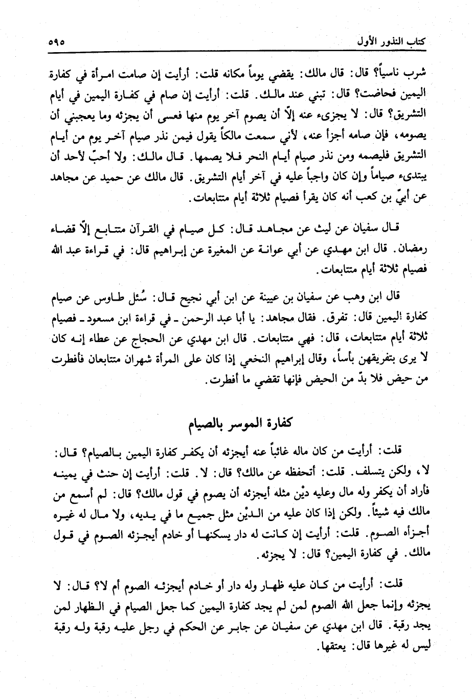 قَالَ ابْنُ مَهْدِيٍّ عَنْ أَبِي عَوَانَةَ عَنْ الْمُغِيرَةِ عَنْ إبْرَاهِيمَ قَالَ: فِي قِرَاءَةِ عَبْدِ اللَّهِ " فَصِيَامُ ثَلَاثَةِ أَيَّامٍ مُتَتَابِعَاتٍ " قَالَ ابْنُ وَهْبٍ عَنْ سُفْيَانَ بْنِ عُيَيْنَةَ عَنْ ابْنِ أَبِي نَجِيحٍ قَالَ: سُئِلَ طَاوُسٌ عَنْ صِيَامِ كَفَّارَةِ الْيَمِينِ قَالَ: تُفَرَّقُ. فَقَالَ مُجَاهِدٌ: يَا أَبَا عَبْدِ الرَّحْمَنِ فِي قِرَاءَةِ ابْنِ مَسْعُودٍ - " فَصِيَامُ ثَلَاثَةِ أَيَّامٍ مُتَتَابِعَاتِ "، قَالَ: فَهِيَ مُتَتَابِعَاتٌ.