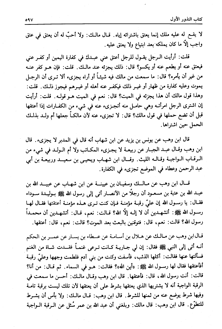 قَالَ ابْنُ وَهْبٍ عَنْ مَالِكٍ وَسُفْيَانَ بْنِ عُيَيْنَةَ عَنْ ابْنِ شِهَابٍ عَنْ عُبَيْدِ اللَّهِ بْنِ عَبْدِ اللَّهِ بْنِ عُتْبَةَ بْنِ مَسْعُودٍ «أَنَّ رَجُلًا مِنْ الْأَنْصَارِ أَتَى إلَى رَسُولِ اللَّهِ - صَلَّى اللَّهُ عَلَيْهِ وَسَلَّمَ - بِوَلِيدَةٍ سَوْدَاءَ فَقَالَ: يَا رَسُولَ اللَّهِ إنَّ عَلَيَّ رَقَبَةً مُؤْمِنَةً فَإِنْ كُنْت تَرَى هَذِهِ مُؤْمِنَةً أَعْتَقْتُهَا فَقَالَ لَهَا رَسُولُ اللَّهِ - صَلَّى اللَّهُ عَلَيْهِ وَسَلَّمَ -: أَتَشْهَدِينَ أَنْ لَا إلَهَ إلَّا اللَّهُ؟ قَالَتْ: نَعَمْ، قَالَ: أَتَشْهَدِينَ أَنَّ مُحَمَّدًا رَسُولُ اللَّهِ؟ قَالَتْ: نَعَمْ، قَالَ: فَتُوقِنِينَ بِالْبَعْثِ بَعْدَ الْمَوْتِ؟ قَالَتْ: نَعَمْ، قَالَ: أَعْتِقْهَا» .