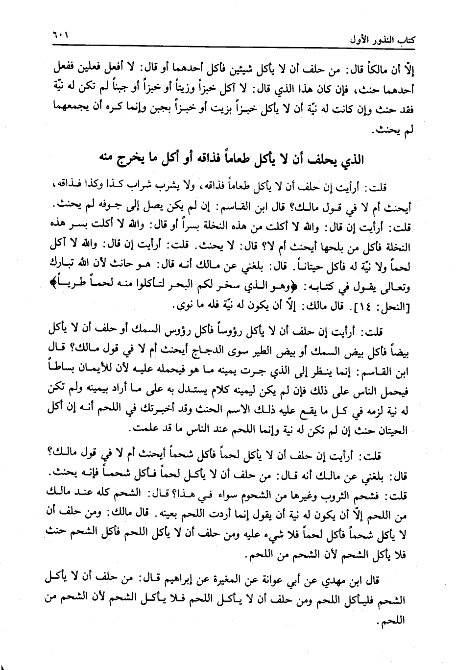 قُلْتُ: أَرَأَيْتَ إنْ قَالَ: وَاَللَّهِ لَا آكُلُ لَحْمًا وَلَا نِيَّةَ لَهُ فَأَكَلَ حِيتَانًا. قَالَ: بَلَغَنِي عَنْ مَالِكٍ أَنَّهُ قَالَ: هُوَ حَانِثٌ لِأَنَّ اللَّهَ تَبَارَكَ وَتَعَالَى يَقُولُ فِي كِتَابِهِ: {وَهُوَ الَّذِي سَخَّرَ الْبَحْرَ لِتَأْكُلُوا مِنْهُ لَحْمًا طَرِيًّا} [النحل: 14] . قَالَ مَالِكٌ: إلَّا أَنْ يَكُونَ لَهُ نِيَّةٌ فَلَهُ مَا نَوَى