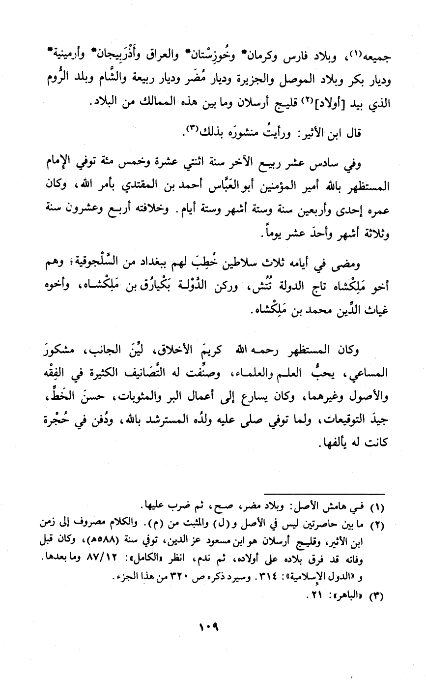 وَمضى فِي أَيَّامه ثَلَاث سلاطين خطب لَهُم بَغْدَاد من السلجوقية وهم أَخُو ملكشاه تَاج الدولة تتش وركن الدولة بكيارق بن ملكشاه وَأَخُوهُ غياث الدّين مُحَمَّد بن ملكشاه