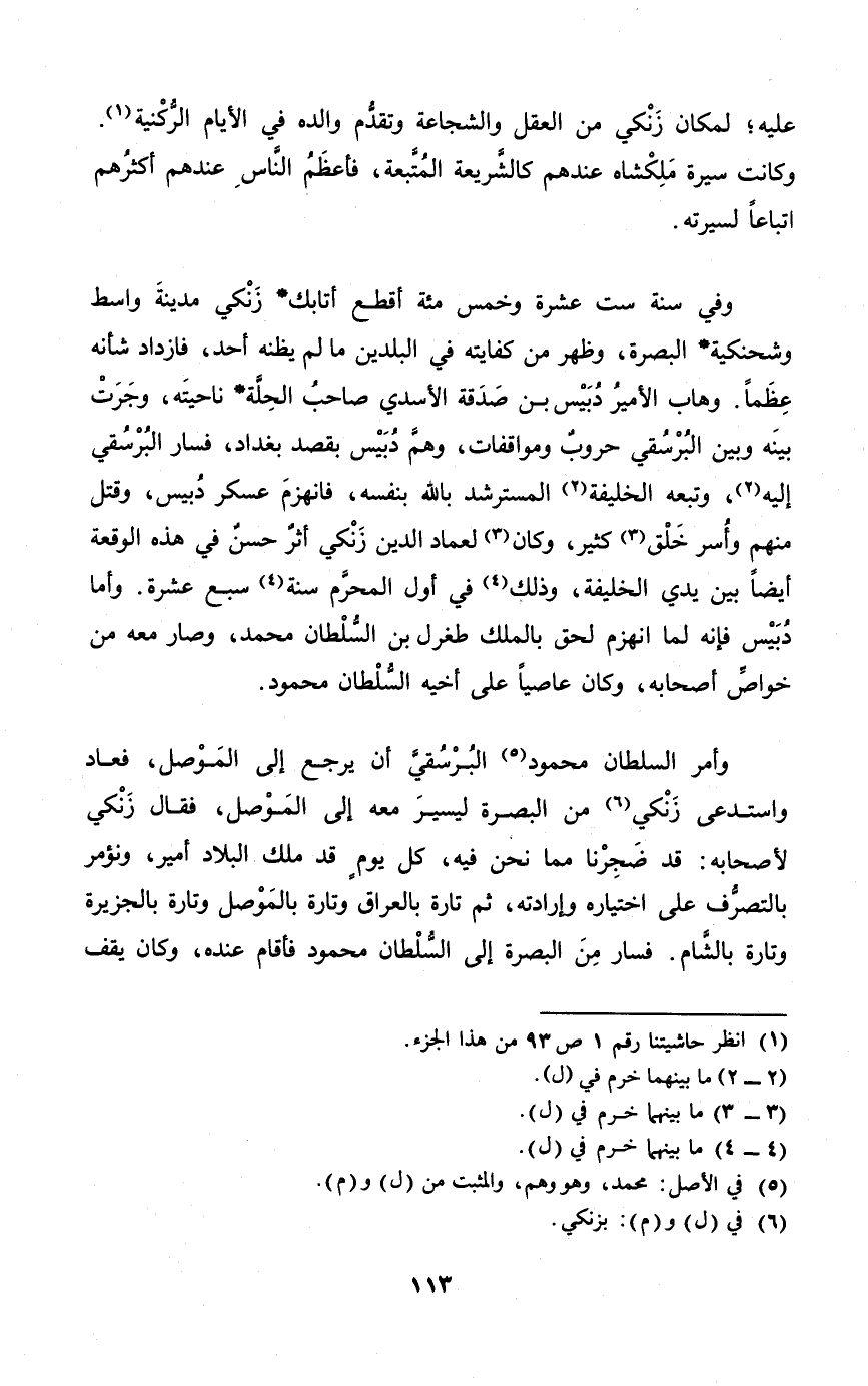 وَأمر السُّلْطَان مَحْمُود البرسقي أَن يرجع إِلَى الْموصل فَعَاد واستدعى زنكي من الْبَصْرَة ليسير مَعَه إِلَى الْموصل فَقَالَ زنكي لأَصْحَابه قد ضجرنا مِمَّا نَحن فِيهِ كل يَوْم قد ملك الْبِلَاد أَمِير ونؤمر بِالتَّصَرُّفِ على اخْتِيَاره وإرادته ثمَّ تَارَة بالعراق وَتارَة بالموصل وَتارَة بالجزيرة وَتارَة بِالشَّام