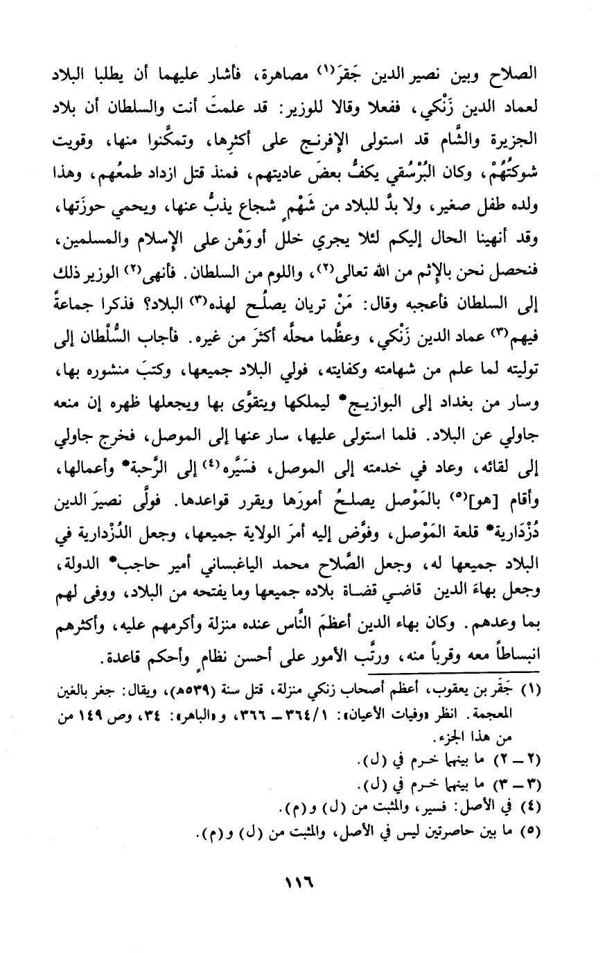 الصّلاح وَبَين نصير الدّين جقر مصاهرة فَأَشَارَ عَلَيْهِمَا أَن يطلبا الْبِلَاد لعماد الدّين زنكي ففعلا وَقَالا للوزير قد علمت أَنْت وَالسُّلْطَان أَن بِلَاد الجزيرة وَالشَّام قد استولى الإفرنج على أَكْثَرهَا وتمكنوا مِنْهَا وقويت شوكتهم وَكَانَ البرسقي يكف بعض عاديتهم فمنذ قتل ازْدَادَ طمعهم وَهَذَا وَلَده طِفْل صَغِير وَلَا بُد للبلاد من شهم شُجَاع يذب عَنْهَا ويحمي حوزتها وَقد أنهينا الْحَال إِلَيْكُم لِئَلَّا يجْرِي خلل أَو وَهن على الْإِسْلَام وَالْمُسْلِمين فنحصل نَحن بالإثم من الله تَعَالَى واللوم من السُّلْطَان