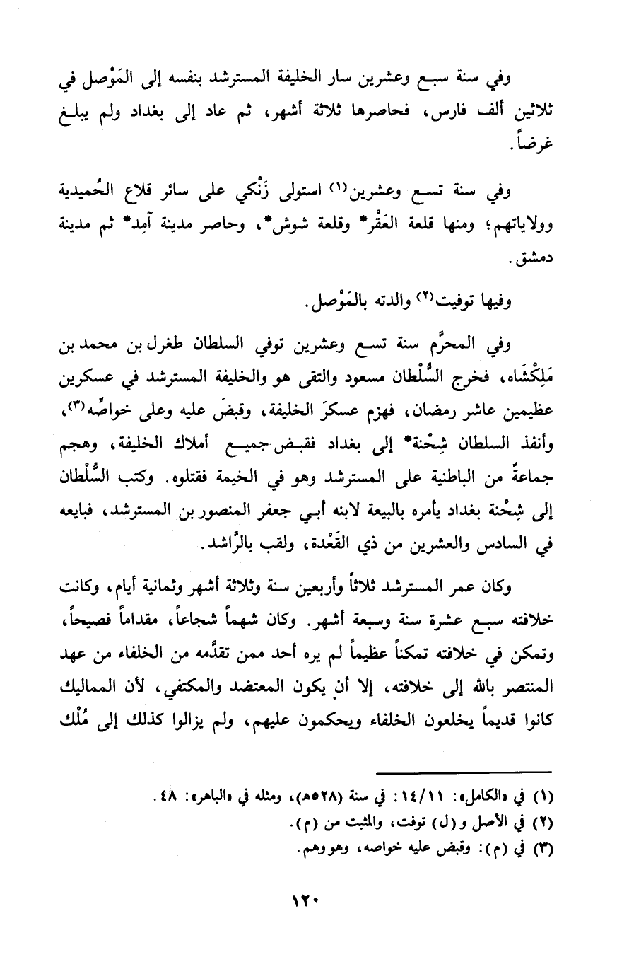 وَفِي الْمحرم سنة تسع وَعشْرين توفى السُّلْطَان طغرل بن مُحَمَّد بن ملكشاه فَخرج السُّلْطَان مَسْعُود والتقى هُوَ والخليفة المسترشد فِي عسكرين عظيمين عَاشر رَمَضَان فَهزمَ عَسْكَر الْخَلِيفَة وَقبض عَلَيْهِ وعَلى خواصه وأنفذ السُّلْطَان شحنة إِلَى بَغْدَاد فَقبض جَمِيع أَمْلَاك الْخَلِيفَة وهجم جمَاعَة من الباطنية على المسترشد وَهُوَ فِي الْخَيْمَة فَقَتَلُوهُ