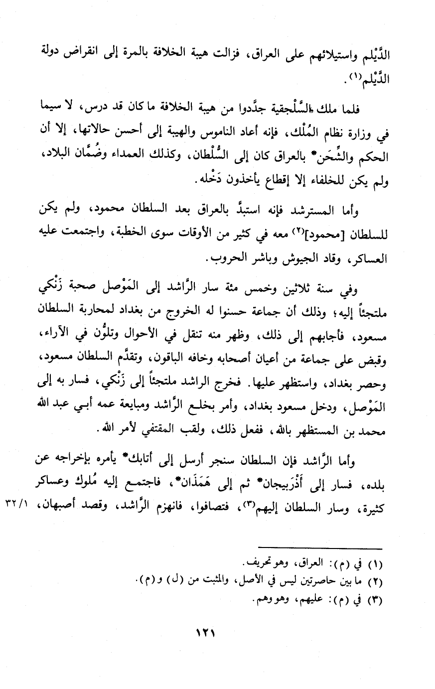 وَأما المسترشد فَإِنَّهُ استبد بالعراق بعد السُّلْطَان مَحْمُود وَلم يكن للسُّلْطَان مَحْمُود مَعَه فِي كثير من الْأَوْقَات سوى الْخطْبَة وَاجْتمعت عَلَيْهِ العساكر وقاد الجيوش وباشر الحروب