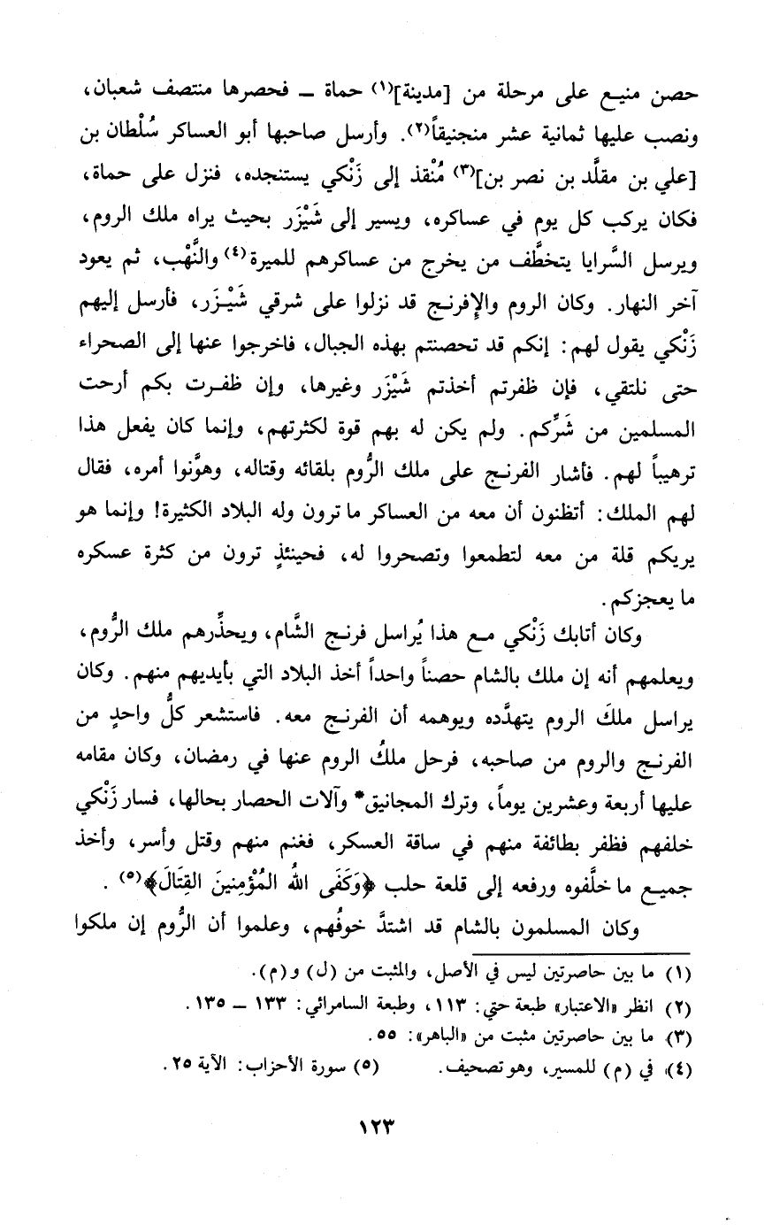 وَكَانَ أتابك زنكي مَعَ هَذَا يراسل فرنح الشَّام ويحذرهم ملك الرّوم وَيُعلمهُم أَنه إِن ملك بِالشَّام حصنا وَاحِدًا أَخذ الْبِلَاد الَّتِي بِأَيْدِيهِم مِنْهُم وَكَانَ يراسل ملك الرّوم يتهدده ويوهمه أَن الفرنج مَعَه فاستشعر كل وَاحِد من الفرنج وَالروم من صَاحبه فَرَحل ملك الرّوم عَنْهَا فِي رَمَضَان وَكَانَ مقَامه عَلَيْهَا أَرْبَعَة وَعشْرين يَوْمًا وَترك المجانيق والآت الْحصار بِحَالِهَا فَسَار زنكي خَلفهم فظفر بطَائفَة مِنْهُم فِي ساقة الْعَسْكَر فغنم مِنْهُم وَقتل وَأسر وَأخذ جَمِيع مَا خلفوه وَرَفعه إِلَى قلعة حلب {وَكفى الله الْمُؤمنِينَ الْقِتَال}