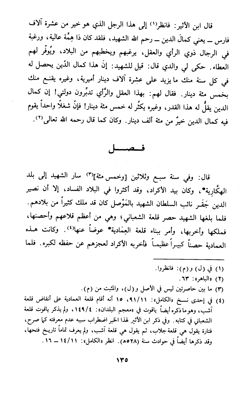 قَالَ ابْن الْأَثِير فَانْظُر إِلَى هَذَا الرجل الَّذِي هُوَ خير من عشرَة آلَاف فَارس يعْنى كَمَال الدّين رحم الله الشَّهِيد فَلَقَد كَانَ ذَا همة عالية ورغبة فِي الرِّجَال ذَوي الرَّأْي وَالْعقل يرغبهم ويخطبهم من الْبِلَاد ويوفر لَهُم الْعَطاء حكى لي وَالِدي قَالَ قيل للشهيد إِن هَذَا كَمَال الدّين يحصل لَهُ فِي كل سنة مِنْك مَا يزِيد على عشرَة آلَاف دِينَار أميرية وَغَيره يقنع مِنْك بِخمْس مئة دِينَار