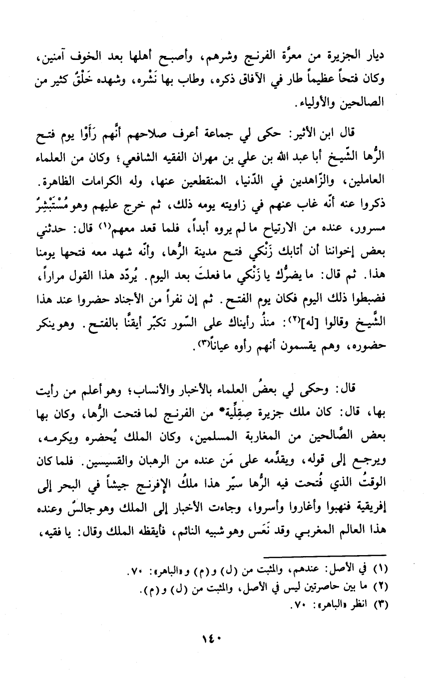 قَالَ ابْن الْأَثِير حكى لي جمَاعَة أعرف صَلَاحهمْ أَنهم رَأَوْا يَوْم فتح الرها الشَّيْخ أَبَا عبد الله بن عَليّ بن مهْرَان الْفَقِيه الشَّافِعِي وَكَانَ من الْعلمَاء العاملين والزاهدين فِي الدُّنْيَا المنقطعين عَنْهَا وَله الكرامات الظَّاهِرَة