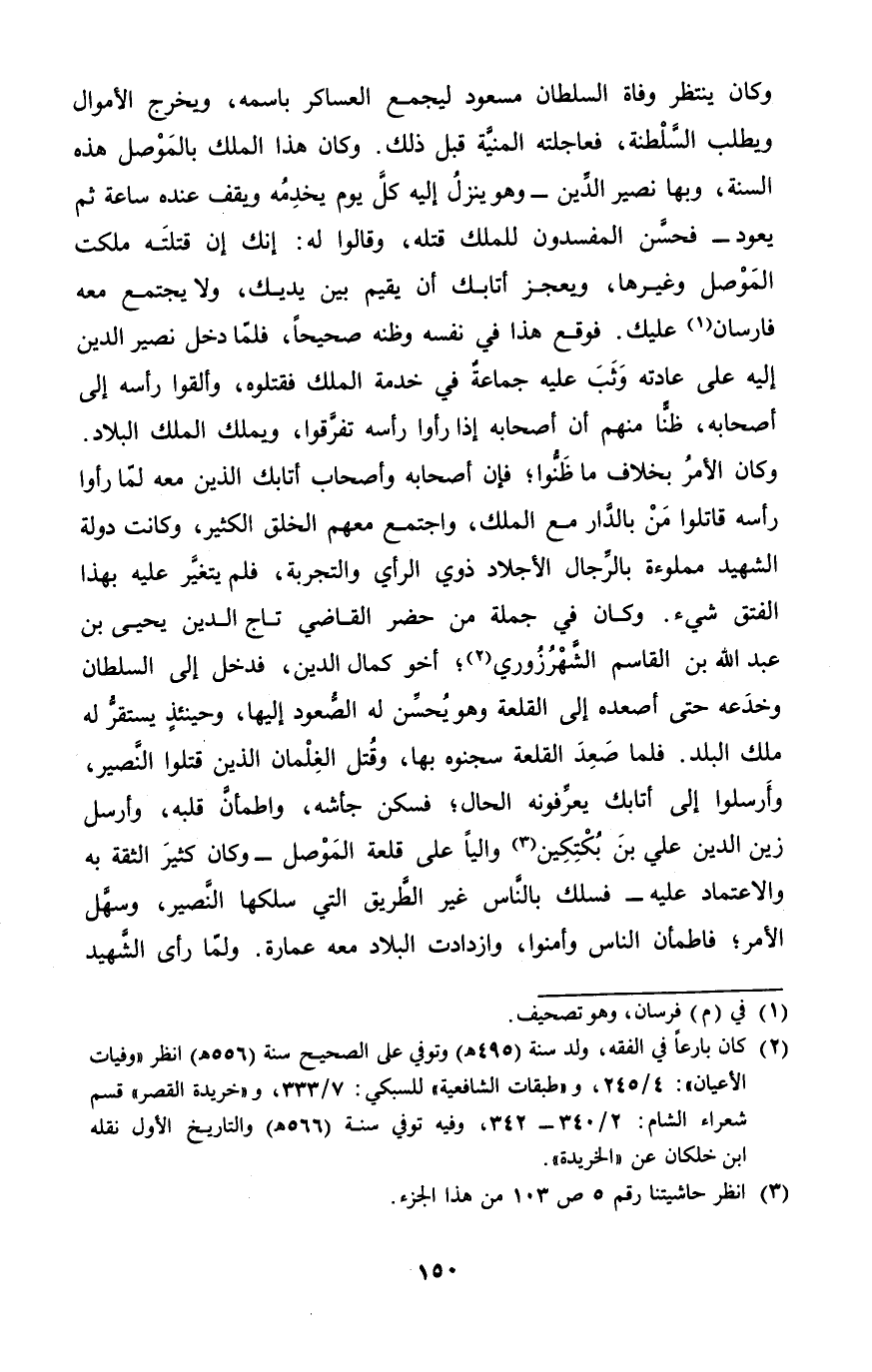 وَكَانَ فِي جملَة من حضر القَاضِي تَاج الدّين يحيى بن عبد الله بن الْقَاسِم الشهرزوري أَخُو كَمَال الدّين فَدخل إِلَى السُّلْطَان وخدعه حَتَّى أصعده إِلَى القلعة وَهُوَ يحسن لَهُ الصعُود إِلَيْهَا وَحِينَئِذٍ يسْتَقرّ لَهُ ملك الْبَلَد فَلَمَّا صعد القلعة سجنوه بهَا وَقتل الغلمان الَّذين قتلوا النصير وَأَرْسلُوا إِلَى أتابك يعرفونه الْحَال فسكن جأشه وَاطْمَأَنَّ قلبه وَأرْسل زين الدّين على بن بكتكين واليا على قلعة الْموصل وَكَانَ كثير الثِّقَة بِهِ والاعتماد عَلَيْهِ فسلك بِالنَّاسِ غير الطَّرِيق الَّتِي سلكها النصير وَسَهل الْأَمر فاطمأن النَّاس وأمنوا وازدادت الْبِلَاد مَعَه عمَارَة