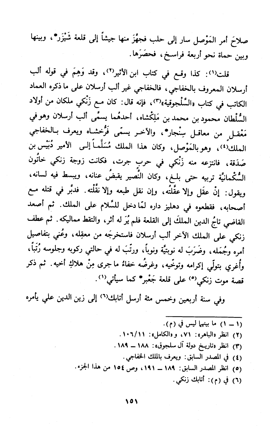 قلت كَذَا وَقع فِي كتاب ابْن الْأَثِير وَقد وهم فِي قَوْله ألب أرسلان الْمَعْرُوف بالخفاجي فالخفاجي غير ألب أرسلان على مَا ذكره الْعِمَاد الْكَاتِب فِي = كتاب السلجوقية = فَإِنَّهُ قَالَ كَانَ مَعَ زنكي ملكان من أَوْلَاد السُّلْطَان مَحْمُود بن مُحَمَّد بن ملكشاه أَحدهمَا يُسمى ألب أرسلان وَهُوَ فِي معقل من معاقل سنجار وَالْآخر يُسمى فرخشاه وَيعرف بالخفاجي الْملك وَهُوَ بالموصل وَكَانَ هَذَا الْملك مُسلما إِلَى الْأَمِير دبيس بن صَدَقَة فانتزعه مِنْهُ زنكي فِي حَرْب جرت فَكَانَت زَوْجَة زنكي خاتون السكمانية تربيه حَتَّى بلغ وَكَانَ النصير يقبض عنانه ويبسط فِيهِ لِسَانه وَيَقُول إِن عقل وَإِلَّا عقلته وَإِن نقل طبعه وَإِلَّا نقلته