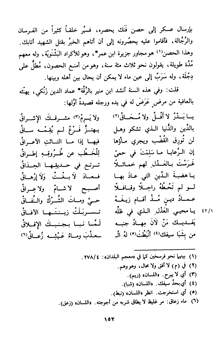 قلت وَفِي هَذِه السّنة أنْشد ابْن مُنِير بالرقة عماد الدّين زنكي يهنئه بالعافية من مرض عرض لَهُ فِي يَده وَرجله قصيدة أَولهَا