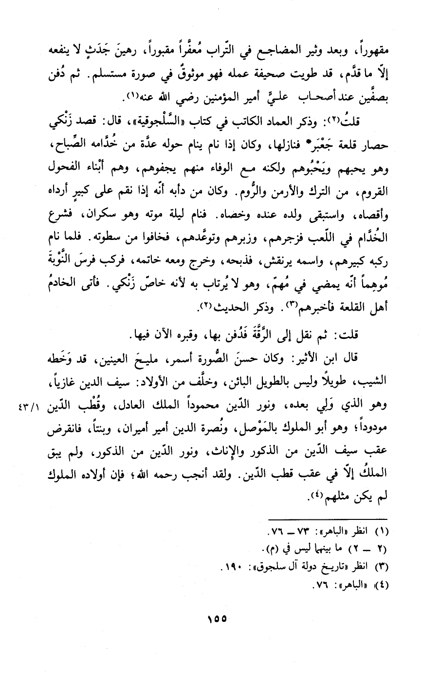قلت وَذكر الْعِمَاد الْكَاتِب فِي = كتاب السلجوقية = قَالَ قصد زنكي حِصَار قلعة جعبر فنازلها وَكَانَ إِذا نَام ينَام حوله عدَّة من خُدَّامه الصَّباح وَهُوَ يُحِبهُمْ ويحبوهم وَلكنه مَعَ الْوَفَاء مِنْهُم يجفوهم وهم أَبنَاء الفحول القروم من التّرْك والأرمن وَالروم