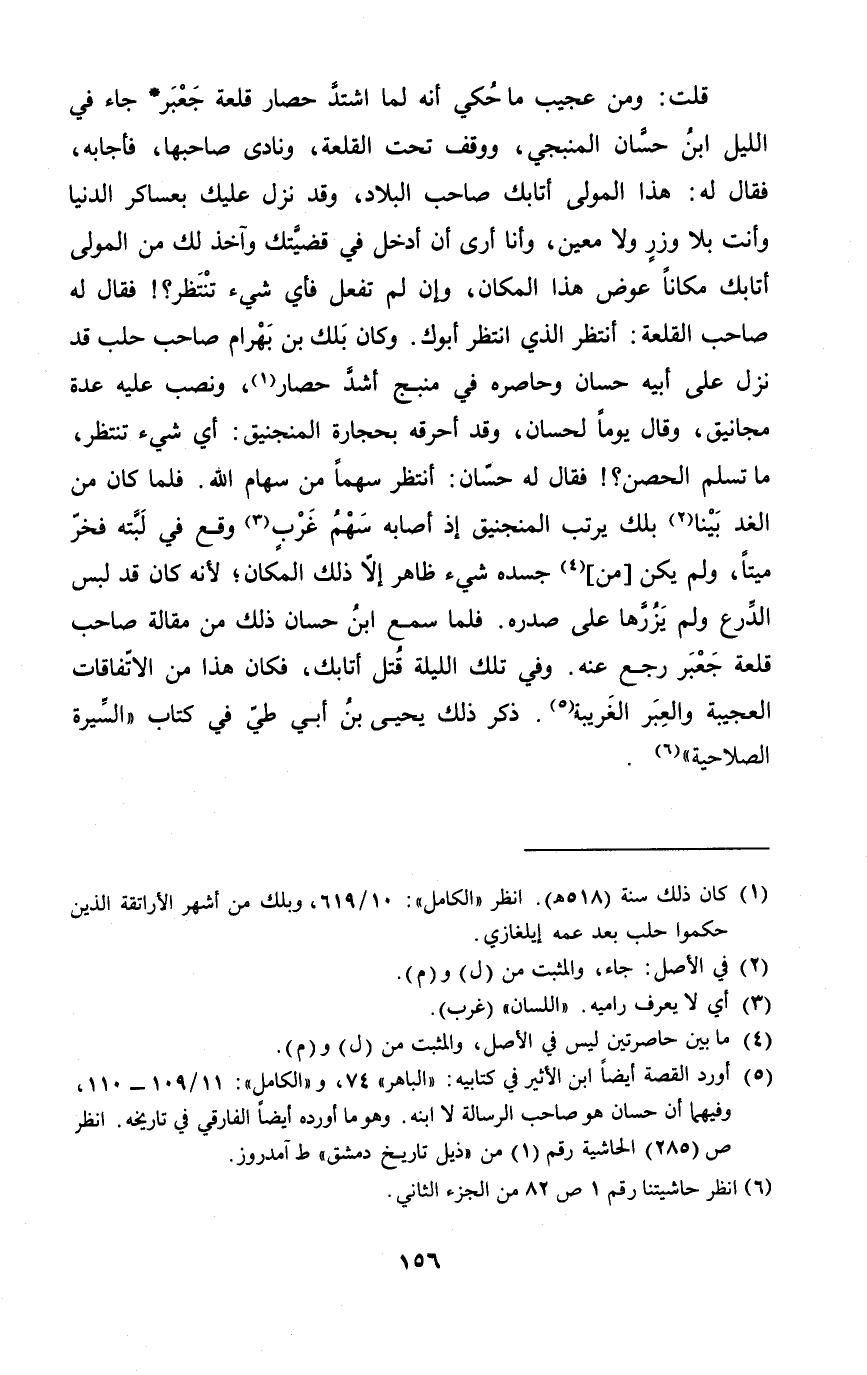 قلت وَمن عَجِيب مَا حكى أَنه لما اشْتَدَّ حِصَار قلعة جعبر جَاءَ فِي اللَّيْل ابْن حسان المنبجي ووقف تَحت القلعة ونادى صَاحبهَا فَأَجَابَهُ فَقَالَ لَهُ هَذَا الْمولى أتابك صَاحب الْبِلَاد وَقد نزل عَلَيْك بعساكر الدُّنْيَا وَأَنت بِلَا وزر وَلَا معِين وَأَنا أرى أَن أَدخل فِي قضيتك وآخذ لَك من الْمولى أتابك مَكَانا عوض هَذَا الْمَكَان وَإِن لم تفعل فَأَي شَيْء تنْتَظر فَقَالَ لَهُ صَاحب القلعة أنْتَظر الَّذِي انْتظر أَبوك