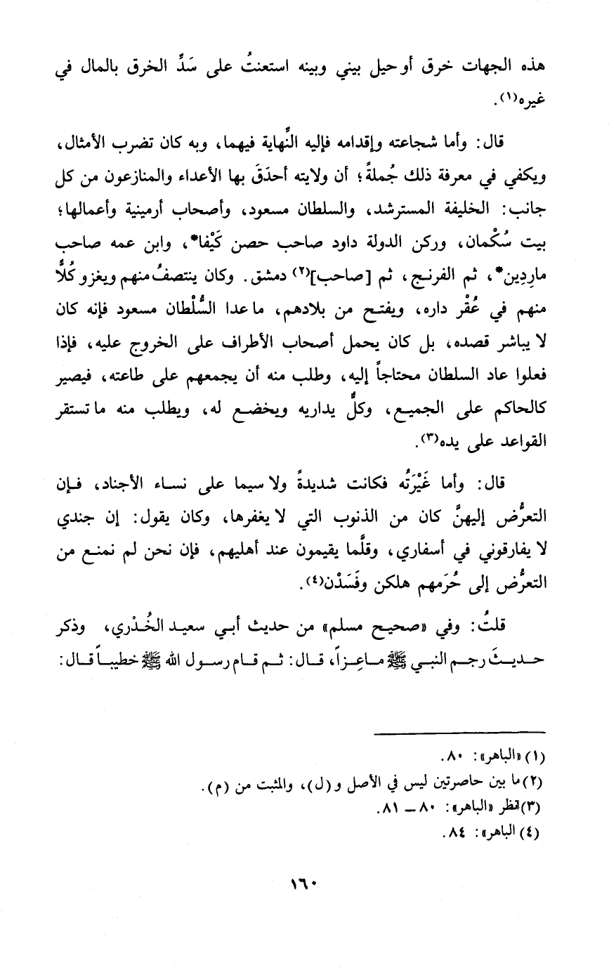 وَكَانَ ينتصف مِنْهُم ويغزو كلا مِنْهُم فِي عقر دَاره وَيفتح من بِلَادهمْ مَا عدا السُّلْطَان مَسْعُود فَإِنَّهُ كَانَ لَا يُبَاشر قَصده بل كَانَ يحمل أَصْحَاب الْأَطْرَاف على الْخُرُوج عَلَيْهِ فَإِذا فعلوا عَاد السُّلْطَان مُحْتَاجا إِلَيْهِ وَطلب مِنْهُ أَن يجمعهُمْ على طَاعَته فَيصير كالحاكم على الْجَمِيع وكل يداريه ويخضع لَهُ وَيطْلب مِنْهُ مَا تَسْتَقِر الْقَوَاعِد على يَده