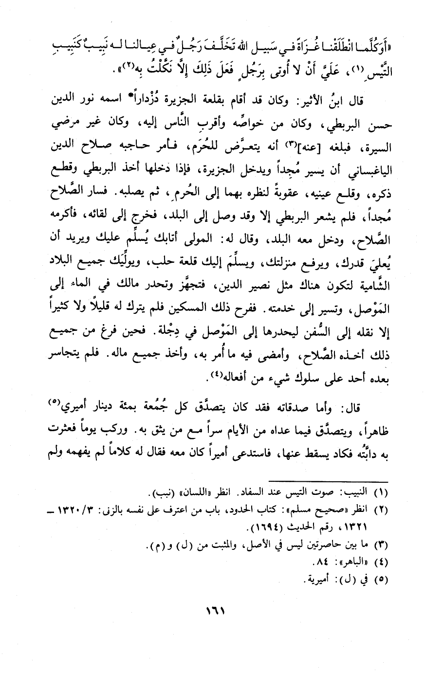 فَسَار الصّلاح مجدا فَلم يشْعر البربطي إِلَّا وَقد وصل إِلَى الْبَلَد فَخرج إِلَى لِقَائِه فَأكْرمه الصّلاح وَدخل مَعَه الْبَلَد وَقَالَ لَهُ الْمولى أتابك يسلم عَلَيْك وَيُرِيد أَن يعلي قدرك وَيرْفَع منزلتك وَيسلم إِلَيْك قلعة حلب ويوليك جَمِيع الْبِلَاد الْبِلَاد الشامية لتَكون هُنَاكَ مثل نصير الدّين فتجهز وتحدر مَالك فِي المَاء إِلَى الْموصل وتسير إِلَى خدمته