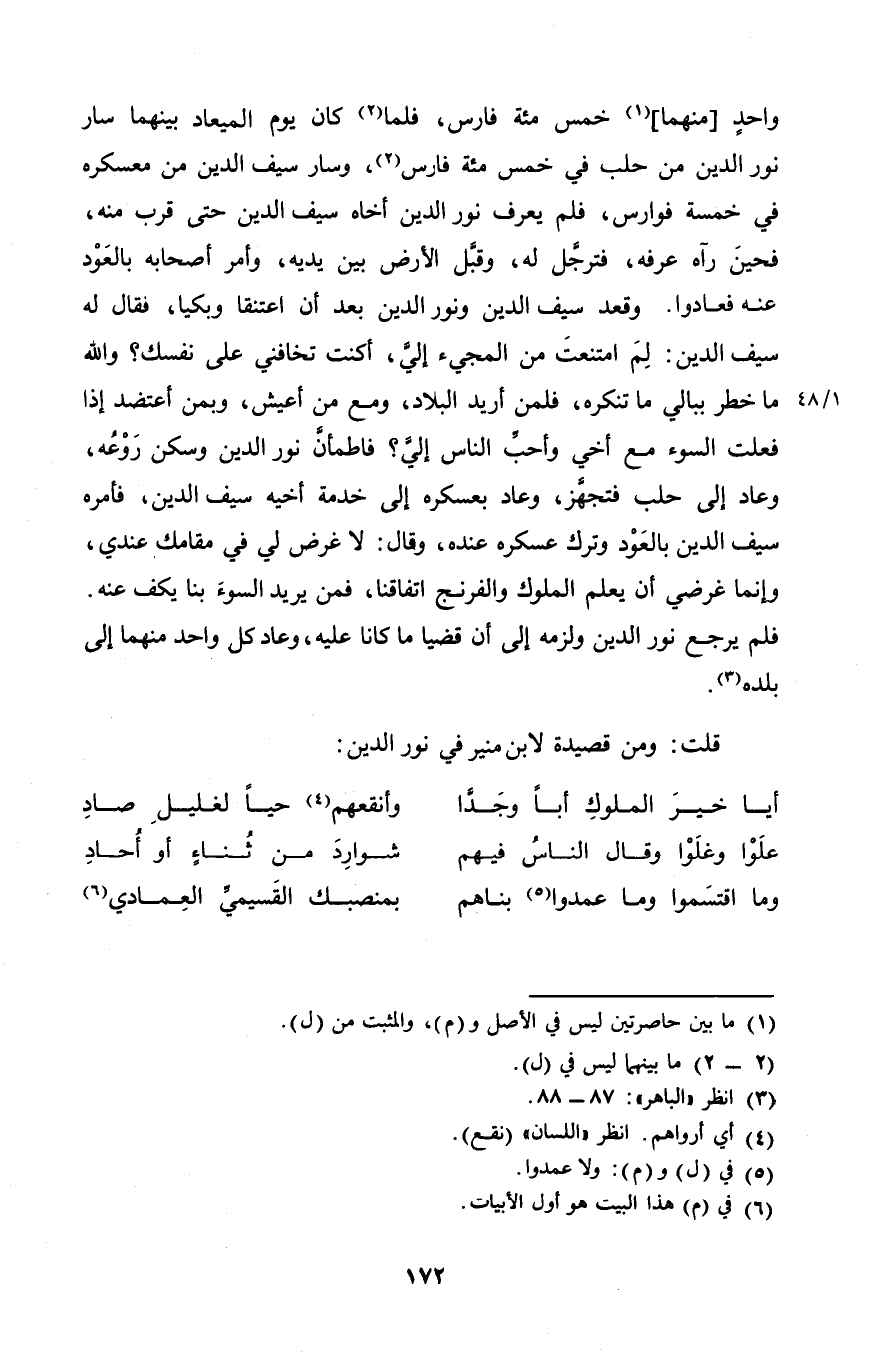 وَقعد سيف الدّين وَنور الدّين بعد أَن اعتنقا وبكيا فَقَالَ لَهُ سيف الدّين لم امْتنعت من الْمَجِيء إِلَيّ أَكنت تخافني على نَفسك وَالله مَا خطر ببالي مَا تنكره فَلِمَنْ أُرِيد الْبِلَاد وَمَعَ من أعيش وبمن أعتضد إِذا فعلت السوء مَعَ أخي وَأحب النَّاس إِلَيّ فاطمأن نور الدّين وَسكن روعه وَعَاد إِلَى حلب فتجهز وَعَاد بعسكره إِلَى خدمَة أَخِيه سيف الدّين فَأمره سيف الدّين بِالْعودِ وَترك عسكره عِنْده وَقَالَ لَا غَرَض لي فِي مقامك عِنْدِي وَإِنَّمَا غرضي أَن يعلم الْمُلُوك والفرنج اتفاقنا فَمن يُرِيد السوء بِنَا يكف عَنهُ