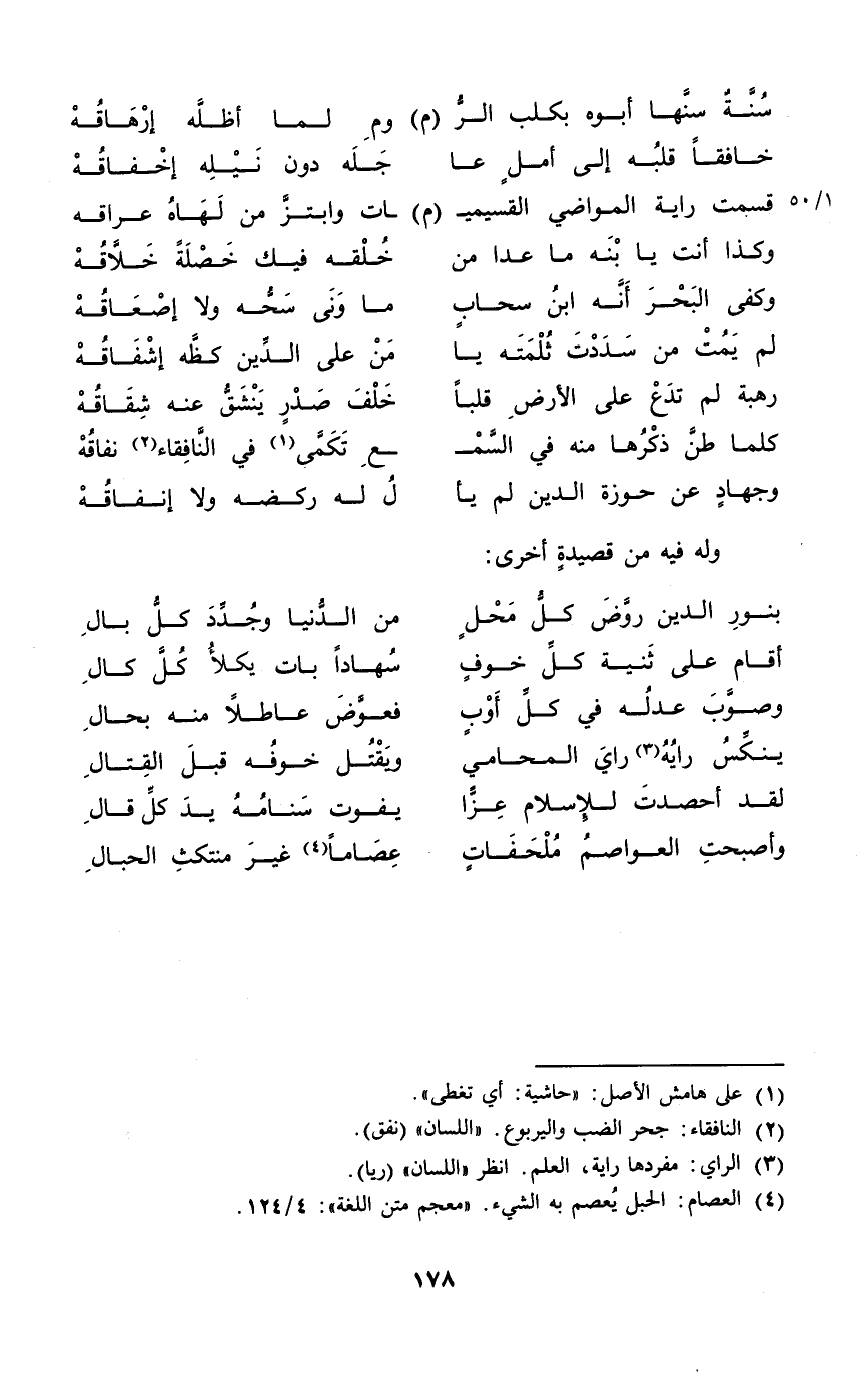 (لقد أحصدت لِلْإِسْلَامِ عزا ... يفوت سنامه يَد كل قَالَ)