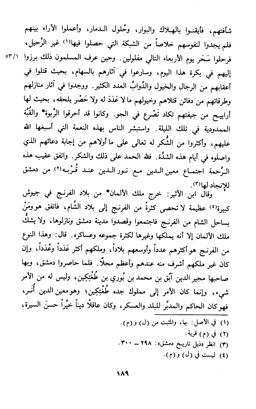 وَقَالَ ابْن الْأَثِير خرج ملك الألمان من بِلَاد الفرنج فِي جيوش كَبِيرَة عَظِيمَة لَا تحصى كَثْرَة من الفرنج إِلَى بِلَاد الشَّام فاتفق هُوَ وَمن بساحل الشَّام من الفرنج فَاجْتمعُوا وقصدوا مَدِينَة دمشق ونازلوها وَلَا يشك ملك الألمان إِلَّا أَنه يملكهَا وَغَيرهَا لِكَثْرَة جموعه وعساكره
