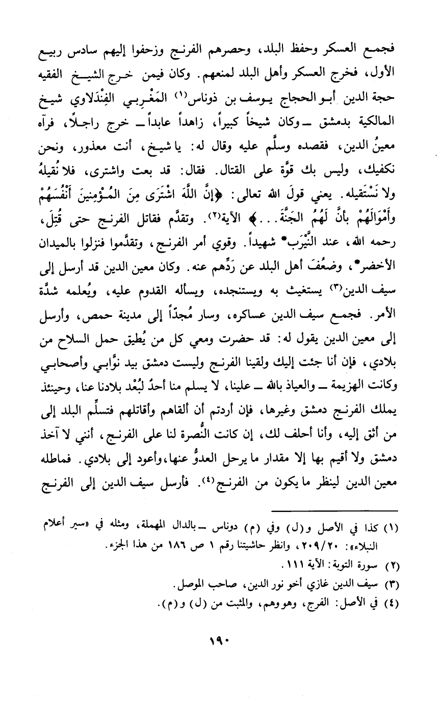 وَكَانَ فِيمَن خرج الشَّيْخ الْفَقِيه حجَّة الدّين أَبُو الْحجَّاج يُوسُف بن ذوناس المغربي الفندلاوي شيخ الْمَالِكِيَّة بِدِمَشْق وَكَانَ شَيخا كَبِيرا زاهدا عابدا خرج رَاجِلا فَرَآهُ معِين الدّين فقصده وَسلم عَلَيْهِ وَقَالَ لَهُ يَا شيخ أَنْت مَعْذُور وَنحن نكفيك وَلَيْسَ بك قُوَّة على الْقِتَال فَقَالَ قد بِعْت وَاشْترى فَلَا نُقيله وَلَا نَسْتَقِيلهُ