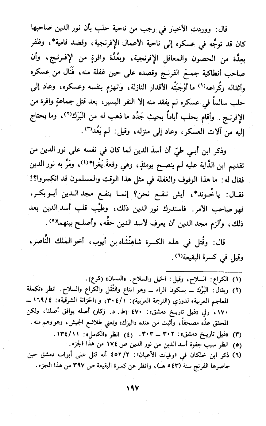 قَالَ ووردت الْأَخْبَار فِي رَجَب من نَاحيَة حلب بِأَن نور الدّين صَاحبهَا كَانَ قد توجه فِي عسكره إِلَى نَاحيَة الْأَعْمَال الإفرنجية وَقصد فامية وظفر بعدة من الْحُصُون والمعاقل الإفرنجية وبعدة وافرة من الإفرنج وان صَاحب أنطاكية جمع الفرنج وقصده على حِين غَفلَة مِنْهُ فَنَال من عسكره وأثقاله وكراعه مَا أوجبته الأقدار النَّازِلَة وَانْهَزَمَ بِنَفسِهِ وَعَسْكَره وَعَاد إِلَى حلب سالما فِي عسكره لم يفقد مِنْهُ إِلَّا النَّفر الْيَسِير بعد قتل جمَاعَة وافرة من الإفرنج