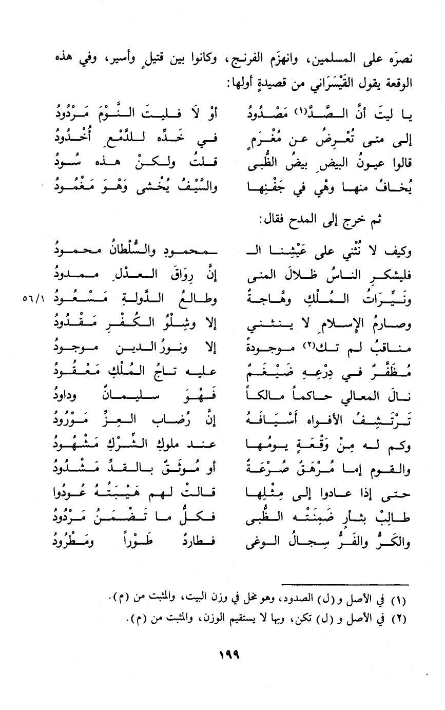 نَصره على الْمُسلمين وَانْهَزَمَ الفرنج وَكَانُوا بَين قَتِيل وأسير وَفِي هَذِه الْوَقْعَة يَقُول القيسراني من قصيدة أَولهَا