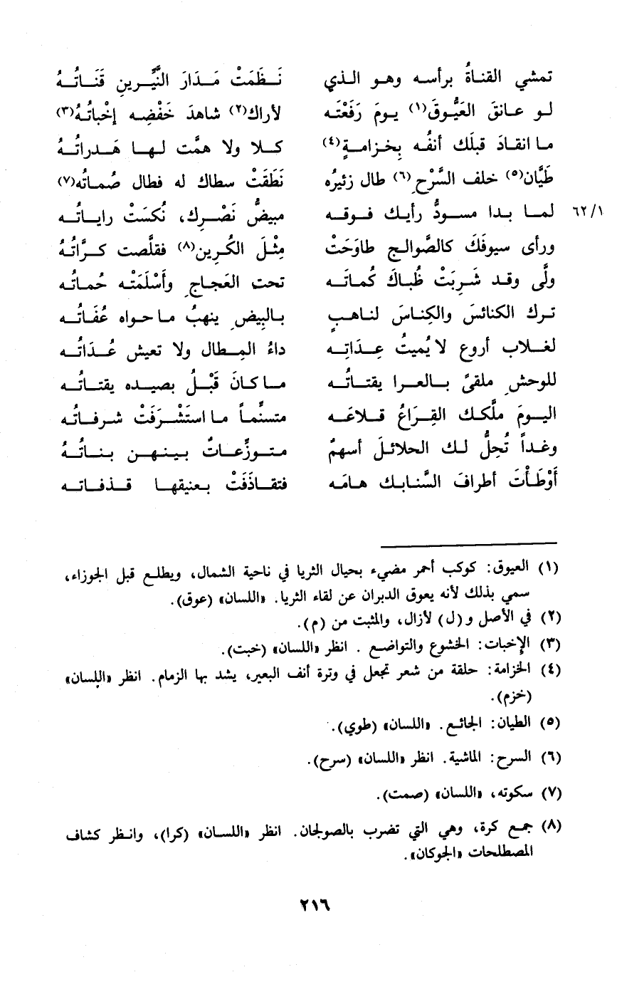 (تمشي الْقَنَاة بِرَأْسِهِ وَهُوَ الَّذِي ... نظمت مدَار النيرين قناته)