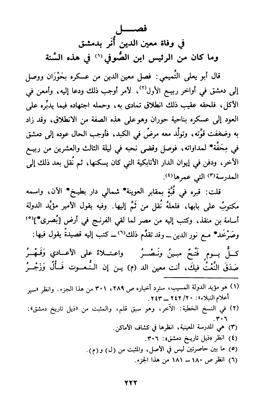 فصل فِي وَفَاة معِين الدّين أنر بِدِمَشْق وَمَا كَانَ من الرئيس ابْن الصُّوفِي فِي هَذِه السّنة
