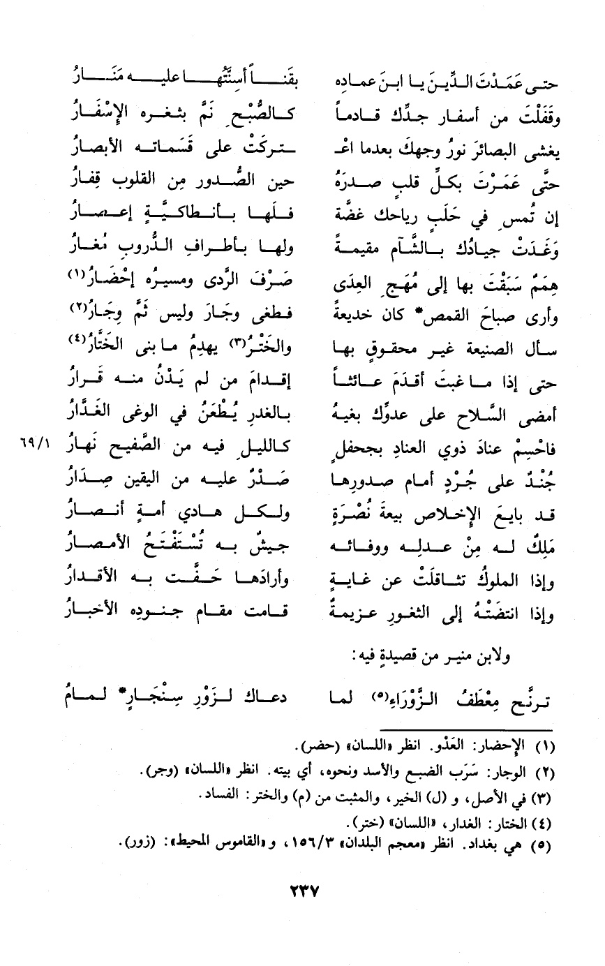 (حَتَّى عَمَدت الدّين يَا ابْن عماده ... بقنا أسنتها عَلَيْهِ منار)