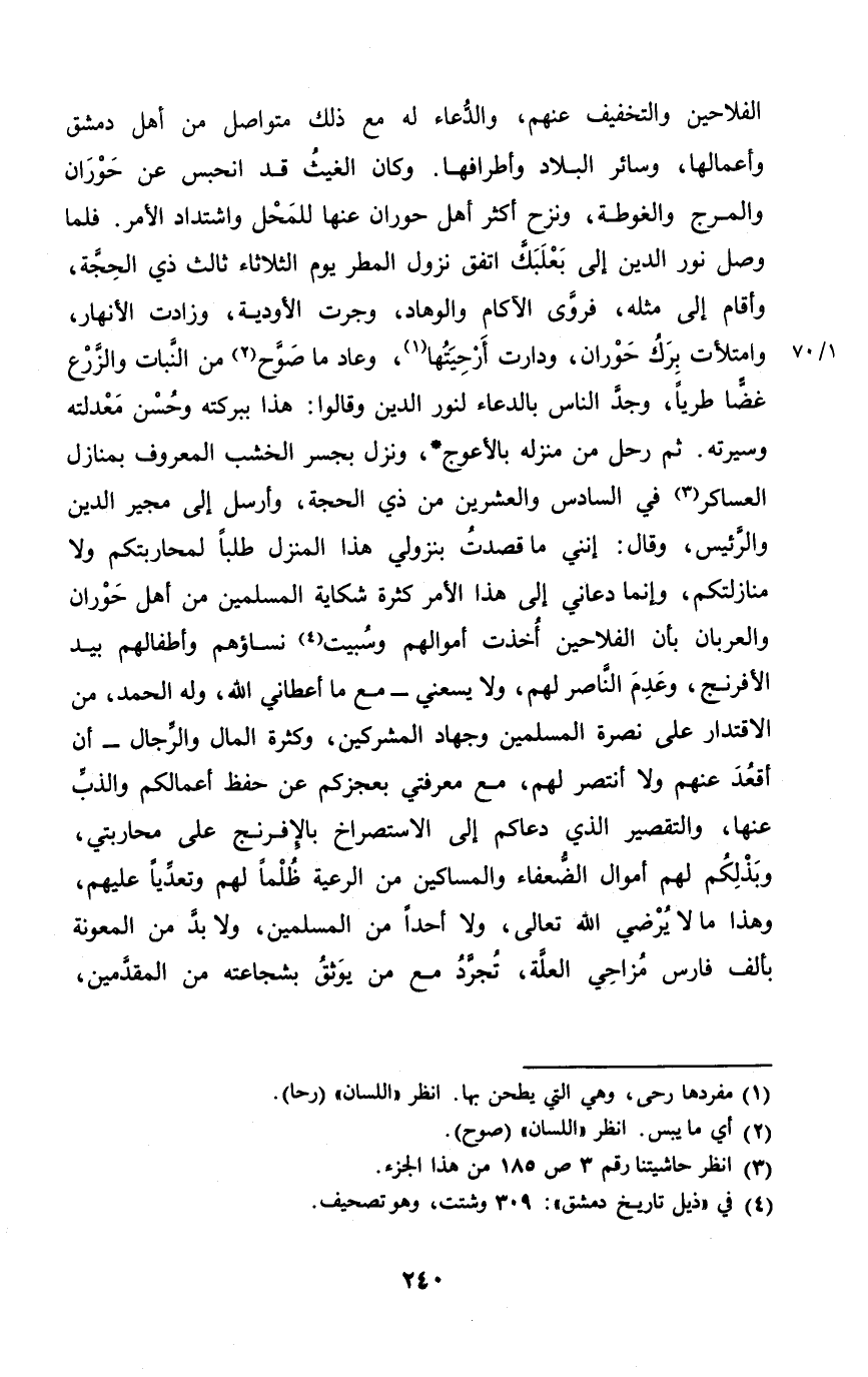 ثمَّ رَحل من منزله بالأعوج وَنزل بجسر الْخشب الْمَعْرُوف بمنازل العساكر فِي السَّادِس وَالْعِشْرين من ذِي الْحجَّة وَأرْسل إِلَى مجير الدّين والرئيس وَقَالَ إِنَّنِي مَا قصدت بنزولي هَذَا الْمنزل طلبا لمحاربتكم وَلَا منازلتكم وَإِنَّمَا دَعَاني إِلَى هَذَا الْأَمر كَثْرَة شكاية الْمُسلمين من أهل حوران والعربان بِأَن الفلاحين أخذت أَمْوَالهم وسبيت نِسَاؤُهُم وأطفالهم بيد الإفرنج وَعدم النَّاصِر لَهُم وَلَا يسعني مَعَ مَا أَعْطَانِي الله وَله الْحَمد من الاقتدار على نصْرَة الْمُسلمين وَجِهَاد الْمُشْركين وَكَثْرَة المَال وَالرِّجَال أَن أقعد عَنْهُم وَلَا أنتصر لَهُم مَعَ معرفتي بعجزكم عَن حفظ أَعمالكُم والذب عَنْهَا وَالتَّقْصِير الَّذِي دعَاكُمْ إِلَى الاستصراخ بالإفرنج على محاربتي وبذلكم لَهُم أَمْوَال الضُّعَفَاء وَالْمَسَاكِين من الرّعية ظلما لَهُم وتعديا عَلَيْهِم وَهَذَا مَا لَا يُرْضِي الله تَعَالَى وَلَا أحدا من الْمُسلمين وَلَا بُد من المعونة بِأَلف فَارس مُزاحِي العلّة تُجرّدُ مَعَ من يوثق بشجاعته من المقدّمين