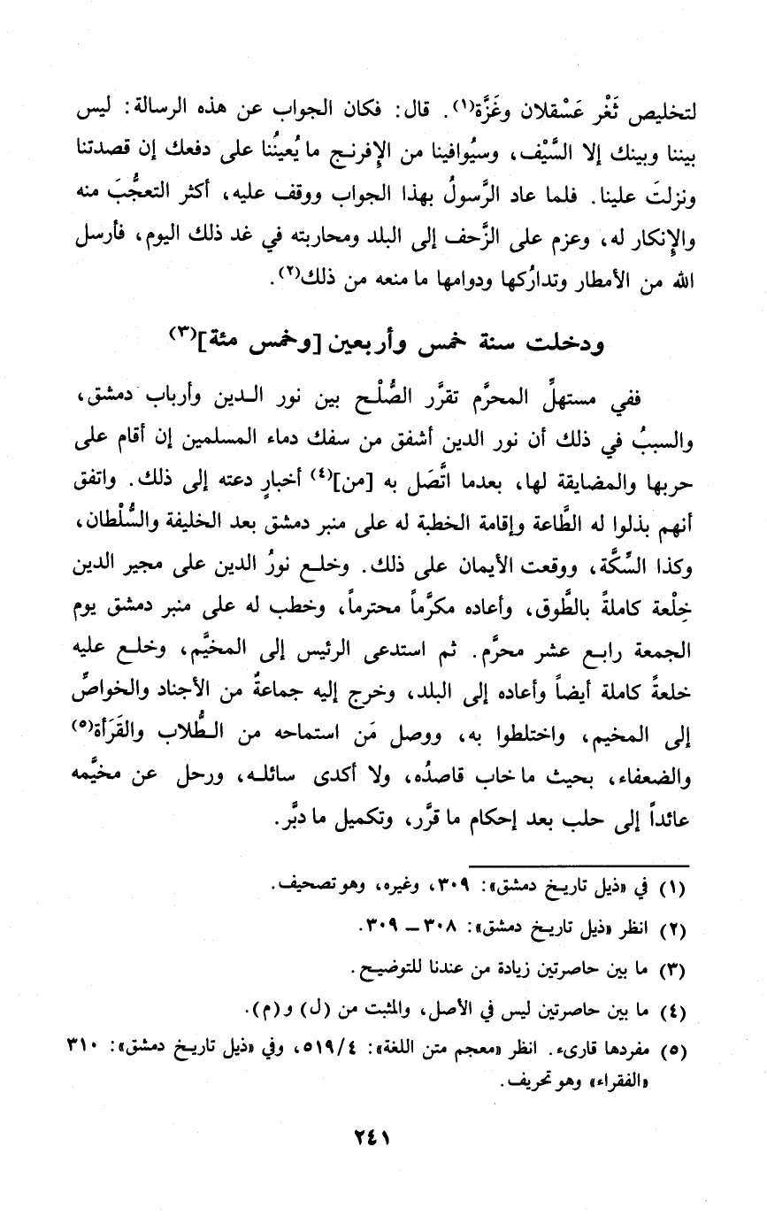فَفِي مستهل الْمحرم تقرر الصُّلْح بَين بَين نور الدّين وأرباب دمشق وَالسَّبَب فِي ذَلِك أَن نور الدّين أشْفق من سفك دِمَاء الْمُسلمين إِن أَقَامَ على حربها والمضايقة لَهَا بَعْدَمَا اتَّصل بِهِ من أَخْبَار دَعَتْهُ إِلَى ذَلِك