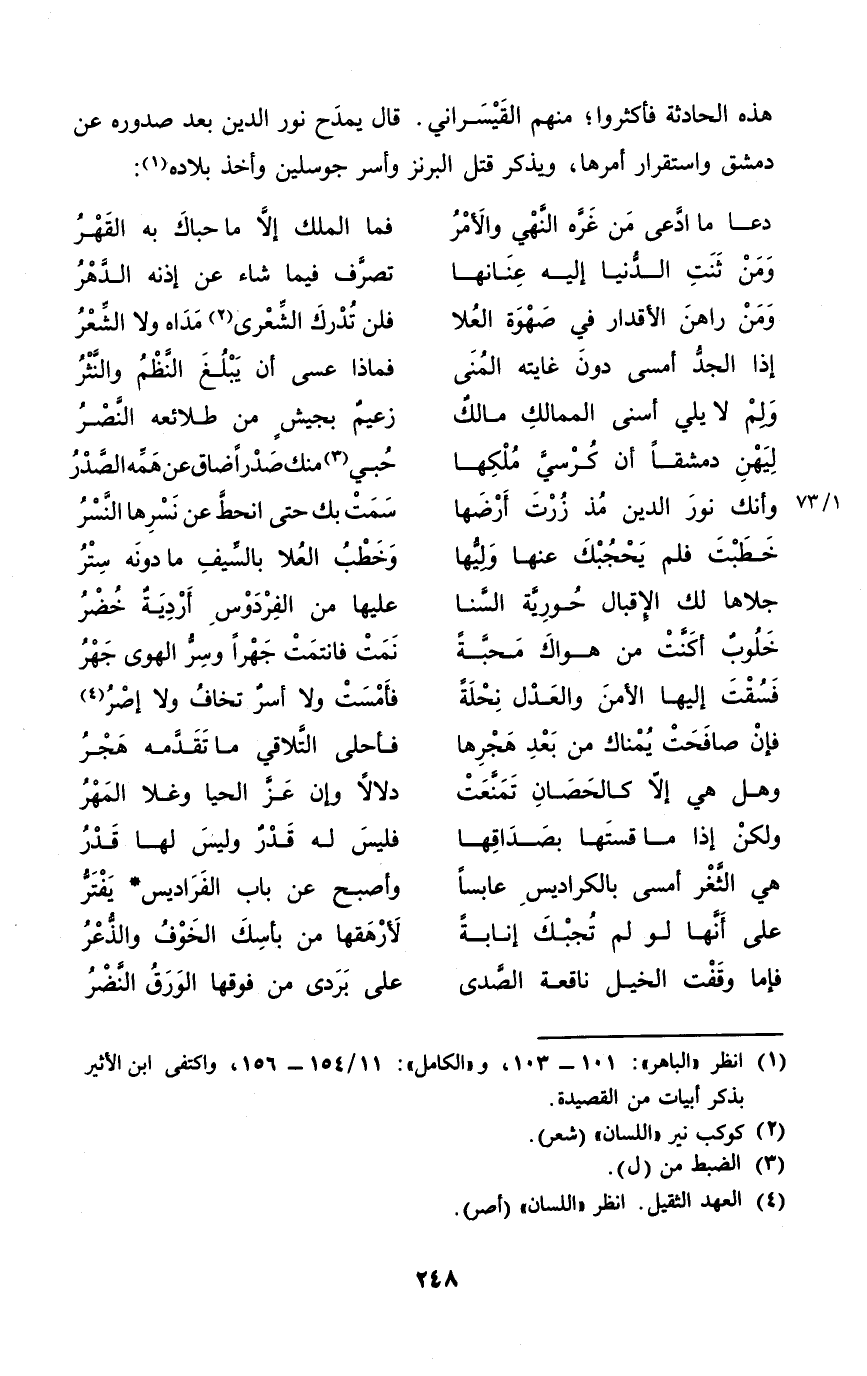 قَالَ يمدح نور الدّين بعد صدوره عَن دمشق واستقرار أمرهَا وَيذكر قتل البرنز وَأسر جوسلين وَأخذ بِلَاده